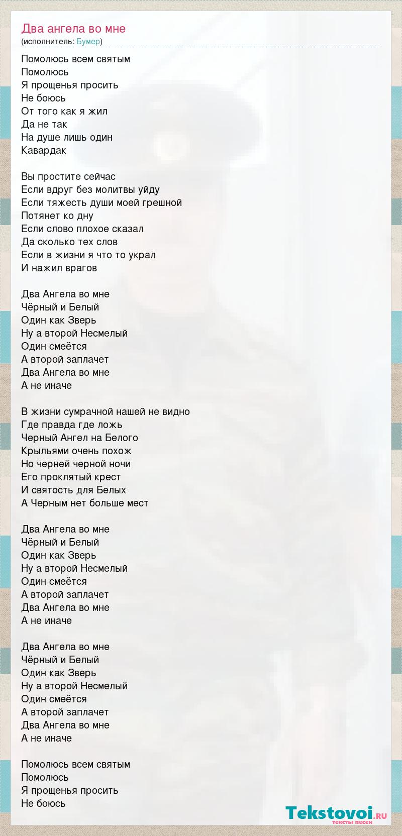 Помолюсь всем святым Помолюсь Я прощенья просить Не боюсь От того как я жил Да не так На душе лишь один Кавардак Вы простите сейчас Если вдруг без молитвы уйду Если тяжесть души моей грешной Потянет ко дну Если слово плохое сказал Да сколько тех слов Если в жизни я что то украл И нажил врагов Два Ангела во мне Чёрный и Белый Один как Зверь Ну а второй Несмелый Один смеётся А второй заплачет Два Ангела во мне А не иначе В жизни сумрачной нашей не видно Где правда где ложь Черный Ангел на Белого Крыльями очень похож Но черней черной ночи Его проклятый крест И святость для Белых А Черным нет больше мест Два Ангела во мне Чёрный и Белый Один как Зверь Ну а второй Несмелый Один смеётся А второй заплачет Два Ангела во мне А не иначе Два Ангела во мне Чёрный и Белый Один как Зверь Ну а второй Несмелый Один смеётся А второй заплачет Два Ангела во мне А не иначе Помолюсь всем святым Помолюсь Я прощенья просить Не боюсь