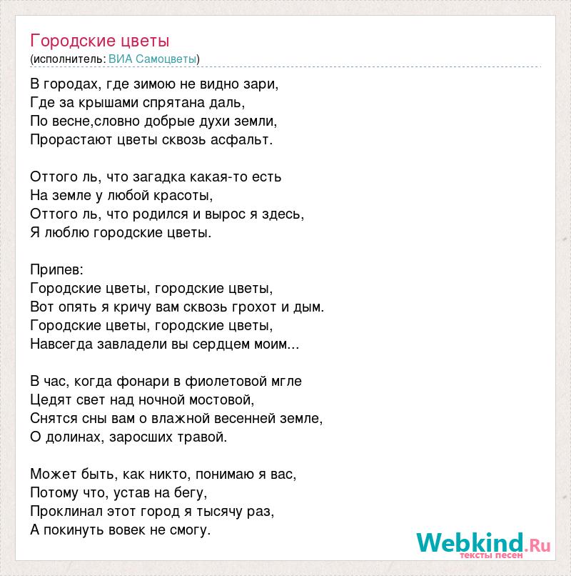 В городах, где зимою не видно зари, Где за крышами спрятана даль, По весне,словно добрые духи земли, Прорастают цветы сквозь асфальт. Оттого ль, что загадка какая-то есть На земле у любой красоты, Оттого ль, что родился и вырос я здесь, Я люблю городские цветы. Припев: Городские цветы, городские цветы, Вот опять я кричу вам сквозь грохот и дым. Городские цветы, городские цветы, Навсегда завладели вы сердцем моим... В час, когда фонари в фиолетовой мгле Цедят свет над ночной мостовой, Снятся сны вам о влажной весенней земле, О долинах, заросших травой. Может быть, как никто, понимаю я вас, Потому что, устав на бегу, Проклинал этот город я тысячу раз, А покинуть вовек не смогу.