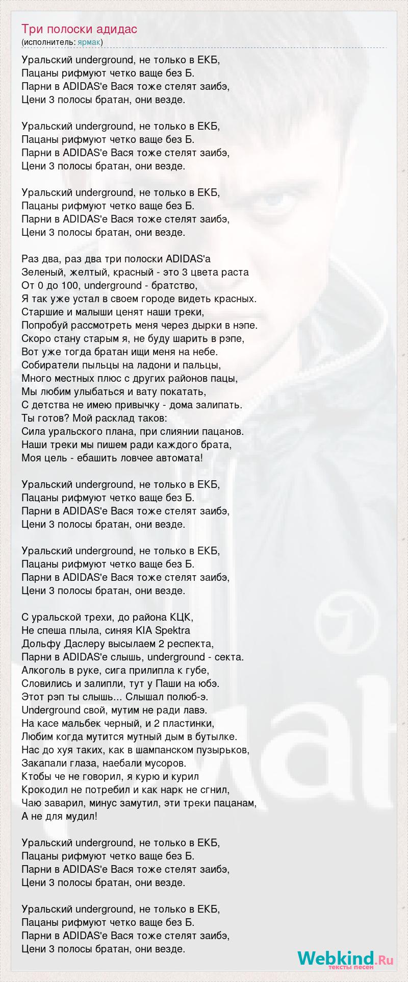 Уральский underground, не только в ЕКБ, Пацаны рифмуют четко ваще без Б. Парни в ADIDAS'e Вася тоже стелят заибэ, Цени 3 полосы братан, они везде. Уральский underground, не только в ЕКБ, Пацаны рифмуют четко ваще без Б. Парни в ADIDAS'e Вася тоже стелят заибэ, Цени 3 полосы братан, они везде. Уральский underground, не только в ЕКБ, Пацаны рифмуют четко ваще без Б. Парни в ADIDAS'e Вася тоже стелят заибэ, Цени 3 полосы братан, они везде. Раз два, раз два три полоски ADIDAS'a Зеленый, желтый, красный - это 3 цвета раста От 0 до 100, underground - братство, Я так уже устал в своем городе видеть красных. Старшие и малыши ценят наши треки, Попробуй рассмотреть меня через дырки в нэпе. Скоро стану старым я, не буду шарить в рэпе, Вот уже тогда братан ищи меня на небе. Собиратели пыльцы на ладони и пальцы, Много местных плюс с других районов пацы, Мы любим улыбаться и вату покатать, С детства не имею привычку - дома залипать. Ты готов? Мой расклад таков: Сила уральского плана, при слиянии пацанов. Наши треки мы пишем ради каждого брата, Моя цель - ебашить ловчее автомата! Уральский underground, не только в ЕКБ, Пацаны рифмуют четко ваще без Б. Парни в ADIDAS'e Вася тоже стелят заибэ, Цени 3 полосы братан, они везде. Уральский underground, не только в ЕКБ, Пацаны рифмуют четко ваще без Б. Парни в ADIDAS'e Вася тоже стелят заибэ, Цени 3 полосы братан, они везде. С уральской трехи, до района КЦК, Не спеша плыла, синяя KIA Spektra Дольфу Даслеру высылаем 2 респекта, Парни в ADIDAS'e слышь, underground - секта. Алкоголь в руке, сига прилипла к губе, Словились и залипли, тут у Паши на юбэ. Этот рэп ты слышь... Слышал полюб-э. Underground свой, мутим не ради лавэ. На касе мальбек черный, и 2 пластинки, Любим когда мутится мутный дым в бутылке. Нас до хуя таких, как в шампанском пузырьков, Закапали глаза, наебали мусоров. Ктобы че не говорил, я курю и курил Крокодил не потребил и как нарк не сгнил, Чаю заварил, минус замутил, эти треки пацанам, А не для мудил! Уральский underground, не только в ЕКБ, Пацаны рифмуют четко ваще без Б. Парни в ADIDAS'e Вася тоже стелят заибэ, Цени 3 полосы братан, они везде. Уральский underground, не только в ЕКБ, Пацаны рифмуют четко ваще без Б. Парни в ADIDAS'e Вася тоже стелят заибэ, Цени 3 полосы братан, они везде.