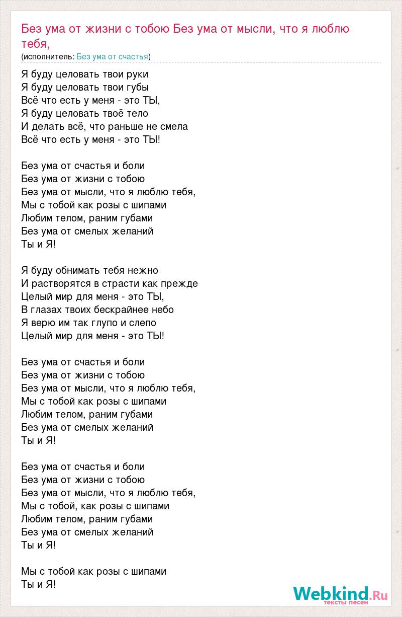 Я буду целовать твои руки Я буду целовать твои губы Всё что есть у меня - это ТЫ, Я буду целовать твоё тело И делать всё, что раньше не смела Всё что есть у меня - это ТЫ! Без ума от счастья и боли Без ума от жизни с тобою Без ума от мысли, что я люблю тебя, Мы с тобой как розы с шипами Любим телом, раним губами Без ума от смелых желаний Ты и Я! Я буду обнимать тебя нежно И растворятся в страсти как прежде Целый мир для меня - это ТЫ, В глазах твоих бескрайнее небо Я верю им так глупо и слепо Целый мир для меня - это ТЫ! Без ума от счастья и боли Без ума от жизни с тобою Без ума от мысли, что я люблю тебя, Мы с тобой как розы с шипами Любим телом, раним губами Без ума от смелых желаний Ты и Я! Без ума от счастья и боли Без ума от жизни с тобою Без ума от мысли, что я люблю тебя, Мы с тобой, как розы с шипами Любим телом, раним губами Без ума от смелых желаний Ты и Я! Мы с тобой как розы с шипами Ты и Я!