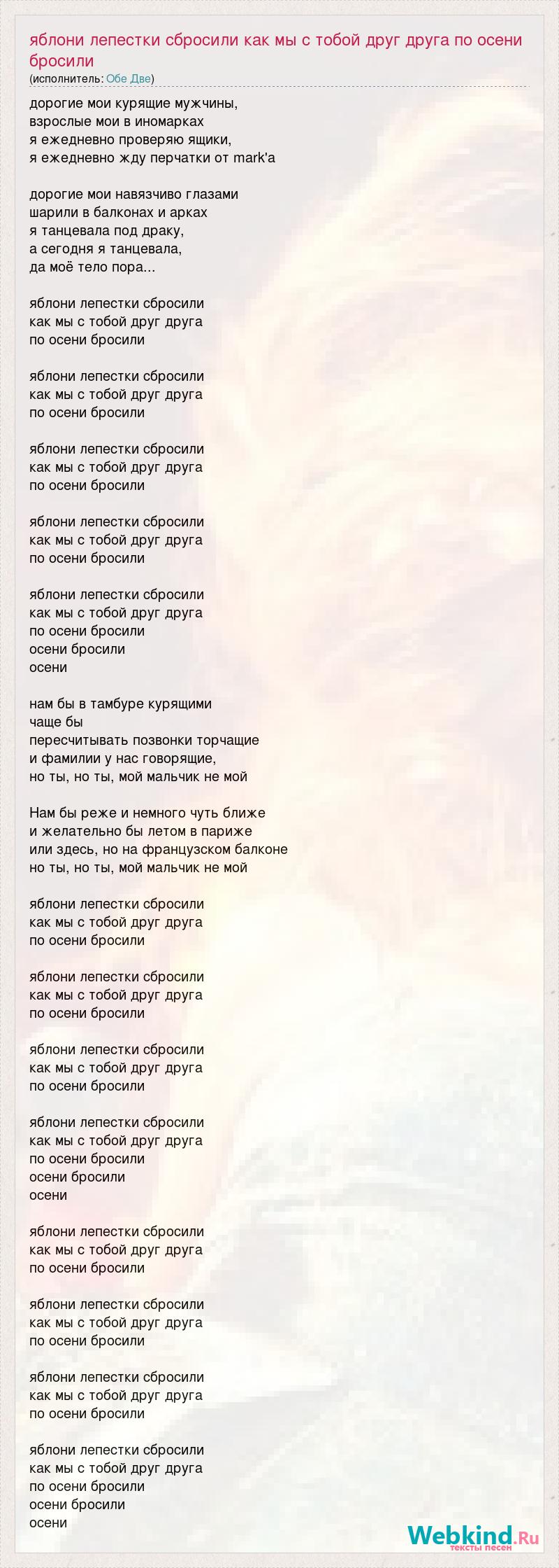 дорогие мои курящие мужчины, взрослые мои в иномарках я ежедневно проверяю ящики, я ежедневно жду перчатки от mark'а дорогие мои навязчиво глазами шарили в балконах и арках я танцевала под драку, а сегодня я танцевала, да моё тело пора... яблони лепестки сбросили как мы с тобой друг друга по осени бросили яблони лепестки сбросили как мы с тобой друг друга по осени бросили яблони лепестки сбросили как мы с тобой друг друга по осени бросили яблони лепестки сбросили как мы с тобой друг друга по осени бросили яблони лепестки сбросили как мы с тобой друг друга по осени бросили осени бросили осени нам бы в тамбуре курящими чаще бы пересчитывать позвонки торчащие и фамилии у нас говорящие, но ты, но ты, мой мальчик не мой Нам бы реже и немного чуть ближе и желательно бы летом в париже или здесь, но на французском балконе но ты, но ты, мой мальчик не мой яблони лепестки сбросили как мы с тобой друг друга по осени бросили яблони лепестки сбросили как мы с тобой друг друга по осени бросили яблони лепестки сбросили как мы с тобой друг друга по осени бросили яблони лепестки сбросили как мы с тобой друг друга по осени бросили осени бросили осени яблони лепестки сбросили как мы с тобой друг друга по осени бросили яблони лепестки сбросили как мы с тобой друг друга по осени бросили яблони лепестки сбросили как мы с тобой друг друга по осени бросили яблони лепестки сбросили как мы с тобой друг друга по осени бросили осени бросили осени