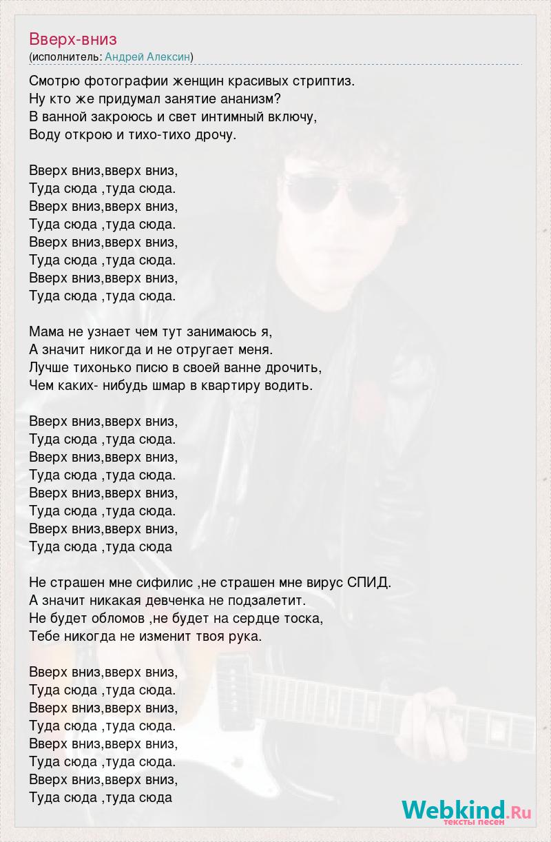 Смотрю фотографии женщин красивых стриптиз. Ну кто же придумал занятие ананизм? В ванной закроюсь и свет интимный включу, Воду открою и тихо-тихо дрочу. Вверх вниз,вверх вниз, Туда сюда ,туда сюда. Вверх вниз,вверх вниз, Туда сюда ,туда сюда. Вверх вниз,вверх вниз, Туда сюда ,туда сюда. Вверх вниз,вверх вниз, Туда сюда ,туда сюда. Мама не узнает чем тут занимаюсь я, А значит никогда и не отругает меня. Лучше тихонько писю в своей ванне дрочить, Чем каких- нибудь шмар в квартиру водить. Вверх вниз,вверх вниз, Туда сюда ,туда сюда. Вверх вниз,вверх вниз, Туда сюда ,туда сюда. Вверх вниз,вверх вниз, Туда сюда ,туда сюда. Вверх вниз,вверх вниз, Туда сюда ,туда сюда Не страшен мне сифилис ,не страшен мне вирус СПИД. А значит никакая девченка не подзалетит. Не будет обломов ,не будет на сердце тоска, Тебе никогда не изменит твоя рука. Вверх вниз,вверх вниз, Туда сюда ,туда сюда. Вверх вниз,вверх вниз, Туда сюда ,туда сюда. Вверх вниз,вверх вниз, Туда сюда ,туда сюда. Вверх вниз,вверх вниз, Туда сюда ,туда сюда