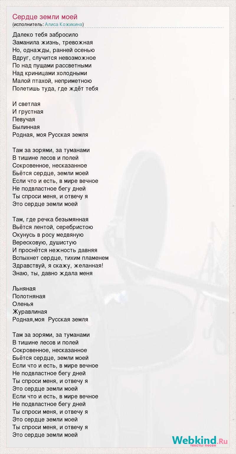 Далеко тебя забросило Заманила жизнь, тревожная Но, однажды, ранней осенью Вдруг, случится невозможное По над пущами рассветными Над криницами холодными Малой птахой, неприметною Полетишь туда, где ждёт тебя И светлая И грустная Певучая Былинная Родная, моя Русская земля Там за зорями, за туманами В тишине лесов и полей Сокровенное, несказанное Бьётся сердце, земли моей Если что и есть, в мире вечное Не подвластное бегу дней Ты спроси меня, и отвечу я Это сердце земли моей Там, где речка безымянная Вьётся лентой, серебристою Окунусь в росу медвяную Вересковую, душистую И проснётся нежность давняя Вспыхнет сердце, тихим пламенем Здравствуй, я скажу, желанная! Знаю, ты, давно ждала меня Льняная Полотняная Оленья Журавлиная Родная,моя Русская земля Там за зорями, за туманами В тишине лесов и полей Сокровенное, несказанное Бьётся сердце, земли моей Если что и есть, в мире вечное Не подвластное бегу дней Ты спроси меня, и отвечу я Это сердце земли моей Если что и есть, в мире вечное Не подвластное бегу дней Ты спроси меня, и отвечу я Это сердце земли моей Ты спроси меня, и отвечу я Это сердце земли моей