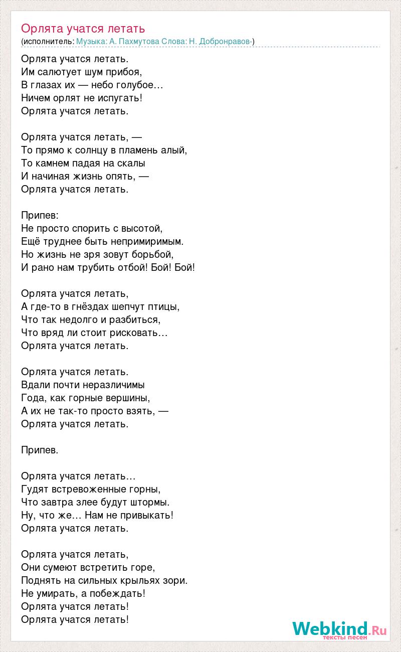 Орлята учатся летать. Им салютует шум прибоя, В глазах их — небо голубое… Ничем орлят не испугать! Орлята учатся летать. Орлята учатся летать, — То прямо к солнцу в пламень алый, То камнем падая на скалы И начиная жизнь опять, — Орлята учатся летать. Припев: Не просто спорить с высотой, Ещё труднее быть непримиримым. Но жизнь не зря зовут борьбой, И рано нам трубить отбой! Бой! Бой! Орлята учатся летать, А где-то в гнёздах шепчут птицы, Что так недолго и разбиться, Что вряд ли стоит рисковать… Орлята учатся летать. Орлята учатся летать. Вдали почти неразличимы Года, как горные вершины, А их не так-то просто взять, — Орлята учатся летать. Припев. Орлята учатся летать… Гудят встревоженные горны, Что завтра злее будут штормы. Ну, что же… Нам не привыкать! Орлята учатся летать. Орлята учатся летать, Они сумеют встретить горе, Поднять на сильных крыльях зори. Не умирать, а побеждать! Орлята учатся летать! Орлята учатся летать!