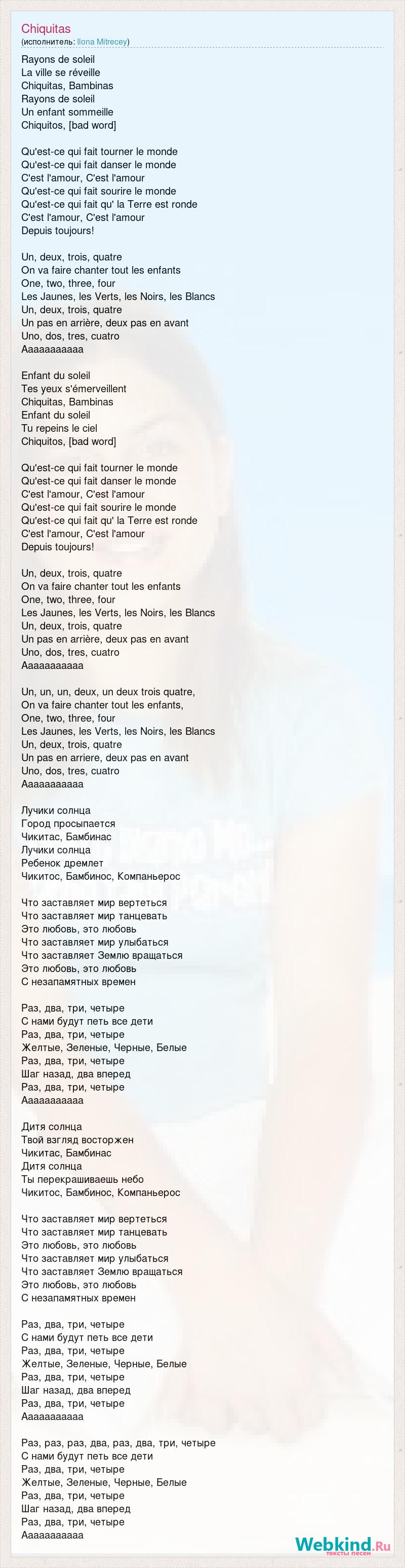 Rayons de soleil La ville se réveille Chiquitas, Bambinas Rayons de soleil Un enfant sommeille Chiquitos, [bad word] Qu'est-ce qui fait tourner le monde Qu'est-ce qui fait danser le monde C'est l'amour, C'est l'amour Qu'est-ce qui fait sourire le monde Qu'est-ce qui fait qu' la Terre est ronde C'est l'amour, C'est l'amour Depuis toujours! Un, deux, trois, quatre On va faire chanter tout les enfants One, two, three, four Les Jaunes, les Verts, les Noirs, les Blancs Un, deux, trois, quatre Un pas en arrière, deux pas en avant Uno, dos, tres, cuatro Aaaaaaaaaaa Enfant du soleil Tes yeux s'émerveillent Chiquitas, Bambinas Enfant du soleil Tu repeins le ciel Chiquitos, [bad word] Qu'est-ce qui fait tourner le monde Qu'est-ce qui fait danser le monde C'est l'amour, C'est l'amour Qu'est-ce qui fait sourire le monde Qu'est-ce qui fait qu' la Terre est ronde C'est l'amour, C'est l'amour Depuis toujours! Un, deux, trois, quatre On va faire chanter tout les enfants One, two, three, four Les Jaunes, les Verts, les Noirs, les Blancs Un, deux, trois, quatre Un pas en arrière, deux pas en avant Uno, dos, tres, cuatro Aaaaaaaaaaa Un, un, un, deux, un deux trois quatre, On va faire chanter tout les enfants, One, two, three, four Les Jaunes, les Verts, les Noirs, les Blancs Un, deux, trois, quatre Un pas en arriere, deux pas en avant Uno, dos, tres, cuatro Aaaaaaaaaaa Лучики солнца Город просыпается Чикитас, Бамбинас Лучики солнца Ребенок дремлет Чикитос, Бамбинос, Компаньерос Что заставляет мир вертеться Что заставляет мир танцевать Это любовь, это любовь Что заставляет мир улыбаться Что заставляет Землю вращаться Это любовь, это любовь С незапамятных времен Раз, два, три, четыре С нами будут петь все дети Раз, два, три, четыре Желтые, Зеленые, Черные, Белые Раз, два, три, четыре Шаг назад, два вперед Раз, два, три, четыре Ааааааааааа Дитя солнца Твой взгляд восторжен Чикитас, Бамбинас Дитя солнца Ты перекрашиваешь небо Чикитос, Бамбинос, Компаньерос Что заставляет мир вертеться Что заставляет мир танцевать Это любовь, это любовь Что заставляет мир улыбаться Что заставляет Землю вращаться Это любовь, это любовь С незапамятных времен Раз, два, три, четыре С нами будут петь все дети Раз, два, три, четыре Желтые, Зеленые, Черные, Белые Раз, два, три, четыре Шаг назад, два вперед Раз, два, три, четыре Ааааааааааа Раз, раз, раз, два, раз, два, три, четыре С нами будут петь все дети Раз, два, три, четыре Желтые, Зеленые, Черные, Белые Раз, два, три, четыре Шаг назад, два вперед Раз, два, три, четыре Ааааааааааа