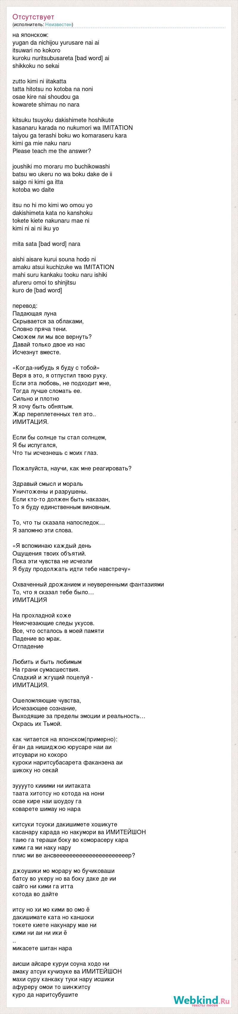 на японском: yugan da nichijou yurusare nai ai itsuwari no kokoro kuroku nuritsubusareta [bad word] ai shikkoku no sekai zutto kimi ni iitakatta tatta hitotsu no kotoba na noni osae kire nai shoudou ga kowarete shimau no nara kitsuku tsuyoku dakishimete hoshikute kasanaru karada no nukumori wa IMITATION taiyou ga terashi boku wo komaraseru kara kimi ga mie naku naru Please teach me the answer? joushiki mo moraru mo buchikowashi batsu wo ukeru no wa boku dake de ii saigo ni kimi ga itta kotoba wo daite itsu no hi mo kimi wo omou yo dakishimeta kata no kanshoku tokete kiete nakunaru mae ni kimi ni ai ni iku yo mita sata [bad word] nara aishi aisare kurui souna hodo ni amaku atsui kuchizuke wa IMITATION mahi suru kankaku tooku naru ishiki afureru omoi to shinjitsu kuro de [bad word] перевод: Падающая луна Скрывается за облаками, Словно пряча тени. Сможем ли мы все вернуть? Давай только двое из нас Исчезнут вместе. «Когда-нибудь я буду с тобой» Веря в это, я отпустил твою руку. Если эта любовь, не подходит мне, Тогда лучше сломать ее. Сильно и плотно Я хочу быть обнятым. Жар переплетенных тел это.. ИМИТАЦИЯ. Если бы солнце ты стал солнцем, Я бы испугался, Что ты исчезнешь с моих глаз. Пожалуйста, научи, как мне реагировать? Здравый смысл и мораль Уничтожены и разрушены. Если кто-то должен быть наказан, То я буду единственным виновным. То, что ты сказала напоследок… Я запомню эти слова. «Я вспоминаю каждый день Ощущения твоих объятий. Пока эти чувства не исчезли Я буду продолжать идти тебе навстречу» Охваченный дрожанием и неуверенными фантазиями То, что я сказал тебе было… ИМИТАЦИЯ На прохладной коже Неисчезающие следы укусов. Все, что осталось в моей памяти Падение во мрак. Отпадение Любить и быть любимым На грани сумасшествия. Сладкий и жгущий поцелуй - ИМИТАЦИЯ. Ошеломляющие чувства, Исчезающее сознание, Выходящие за пределы эмоции и реальность… Окрась их Тьмой. как читается на японском(примерно): ёган да нишиджою юрусаре наи аи итсувари но кокоро куроки наритсубасарета факанзена аи шикоку но секай зууууто кииими ни иитаката таата хитотсу но котода на нони осае кире наи шоудоу га коварете шимау но нара китсуки тсуоки дакишимете хошикуте касанару карада но накумори ва ИМИТЕЙШОН таию га тераши боку во коморасеру кара кими га ми наку нару плис ми ве ансвеееееееееееееееееееееер? джоушики мо морару мо бучиковаши батсу во укеру но ва боку даке де ии сайго ни кими га итта котода во дайте итсу но хи мо кими во омо ё дакишимате ката но каншоки токете киете накунару мае ни кими ни аи ни ики ё .. микасете шитан нара аисши айсаре куруи соуна ходо ни амаку атсуи кучизуке ва ИМИТЕЙШОН махи суру канкаку туки нару исшики афуреру омои то шинжитсу куро да наритсубушите