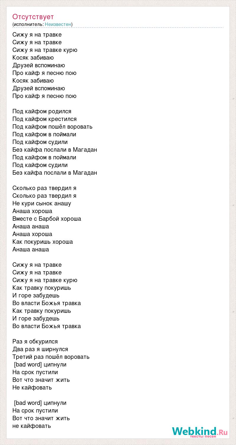Сижу я на травке Сижу я на травке Сижу я на травке курю Косяк забиваю Друзей вспоминаю Про кайф я песню пою Косяк забиваю Друзей вспоминаю Про кайф я песню пою Под кайфом родился Под кайфом крестился Под кайфом пошёл воровать Под кайфом в поймали Под кайфом судили Без кайфа послали в Магадан Под кайфом в поймали Под кайфом судили Без кайфа послали в Магадан Сколько раз твердил я Сколько раз твердил я Не кури сынок анашу Анаша хороша Вместе с Барбой хороша Анаша анаша Анаша хороша Как покуришь хороша Анаша анаша Сижу я на травке Сижу я на травке Сижу я на травке курю Как травку покуришь И горе забудешь Во власти Божья травка Как травку покуришь И горе забудешь Во власти Божья травка Раз я обкурился Два раз я ширнулся Третий раз пошёл воровать [bad word] ципнули На срок пустили Вот что значит жить Не кайфовать [bad word] ципнули На срок пустили Вот что значит жить не кайфовать