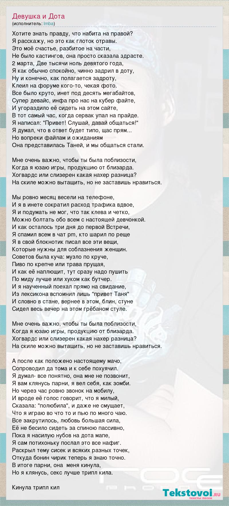 Хотите знать правду, что набита на правой? Я расскажу, но это как глоток отравы. Это моё счастье, разбитое на части, Не было кастингов, она просто сказала здрасте. 2 марта, Две тысячи ноль девятого года, Я как обычно спокойно, чинно задрил в доту, Ну и конечно, как полагается задроту, Клеил на форуме кого-то, чекая фото. Все было круто, инет под десять мегабайтов, Супер девайс, инфа про нас на кубер файте, И угораздило её сидеть на этом сайте, В тот самый час, когда сервак упал на прайде. Я написал: "Привет! Слушай, давай общаться!" Я думал, что в ответ будет типо, щас прям... Но вопреки файлам и ожиданиям Она представилась Таней, и мы общаться стали. Мне очень важно, чтобы ты была поблизости, Когда я юзаю игры, продукцию от близарда. Хогвардс или слизерен какая нахер разница? На скиле можно вытащить, но не заставишь нравиться. Мы ровно месяц весели на телефоне, И я в инете сократил расход трафика вдвое, Я и подумать не мог, что так клева и четко, Можно болтать обо всем с настоящей девчонкой. И как осталось три дня до первой Встречи, Я спамил всем в чат pm, кто шарил по реще Я в свой блокнотик писал все эти вещи, Которые нужны для соблазнения женщин. Советов была куча: музло по круче, Пиво по крепче или трава прущая, И как её наплющит, тут сразу надо пушить По миду лучше или хуком как бутчер. И я наученный поехал прямо на свидание, Из лексикона вспомнил лишь "привет Таня" И словно в стане, вернее в этом, блин, стуне Сидел весь вечер на этом грёбаном стуле. Мне очень важно, чтобы ты была поблизости, Когда я юзаю игры, продукцию от близарда. Хогвардс или слизерен какая нахер разница? На скиле можно вытащить, но не заставишь нравиться. А после как положено настоящему мачо, Сопроводил да тома и к себе похуячил. Я думал- все понятно, она мне не позвонит, Я вам клянусь парни, я вел себя, как зомби. Но через час ровно звонок на мобилу, И вроде её голос говорит, что я милый, Сказала: "полюбила", и даже не смущает, Что я играю во что то и пью по много чаю. Все закрутилось, любовь большая сила, Её не бесило сидеть за спиною пассивно, Пока я насилую нубов на дота мапе, Я сам потихоньку послал это все нафиг. Раскрыл тему сисек и всяких разных точек, Откуда бонин чирик теперь я знаю точно. В итоге парни, она меня кинула, Но я клянусь, секс лучше трипл кила. Кинула трипл кил