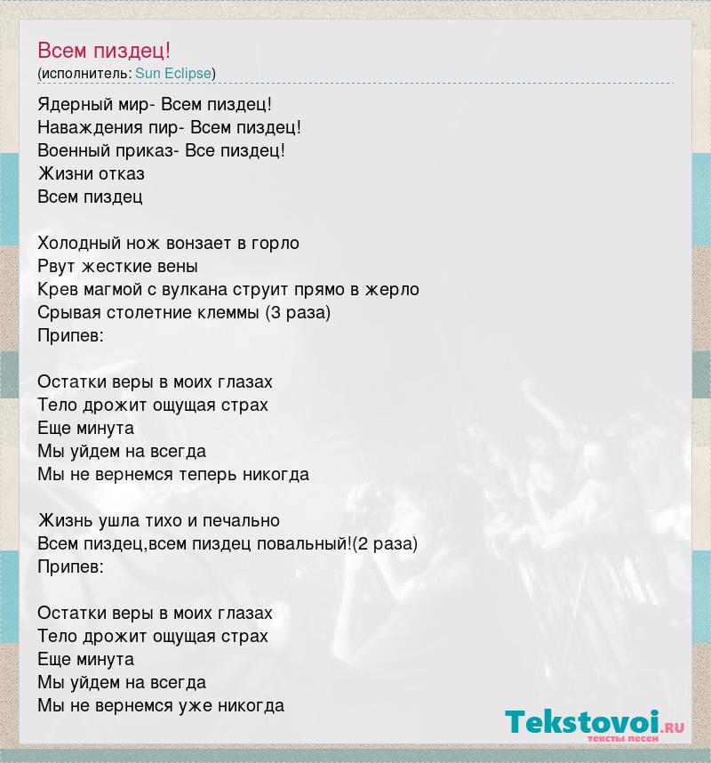 Ядерный мир- Всем пиздец! Наваждения пир- Всем пиздец! Военный приказ- Все пиздец! Жизни отказ Всем пиздец Холодный нож вонзает в горло Рвут жесткие вены Крев магмой с вулкана струит прямо в жерло Срывая столетние клеммы (3 раза) Припев: Остатки веры в моих глазах Тело дрожит ощущая страх Еще минута Мы уйдем на всегда Мы не вернемся теперь никогда Жизнь ушла тихо и печально Всем пиздец,всем пиздец повальный!(2 раза) Припев: Остатки веры в моих глазах Тело дрожит ощущая страх Еще минута Мы уйдем на всегда Мы не вернемся уже никогда