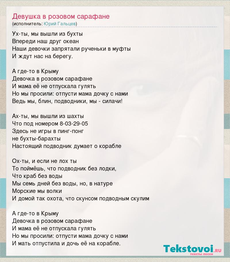 Ух-ты, мы вышли из бухты Впереди наш друг океан Наши девочки запрятали рученьки в муфты И ждут нас на берегу. А где-то в Крыму Девочка в розовом сарафане И мама её не отпускала гулять Но мы просили: отпусти мама дочку с нами Ведь мы, блин, подводники, мы - силачи! Ах-ты, мы вышли из шахты Что под номером 8-03-29-05 Здесь не игры в пинг-понг не бухты-барахты Настоящий подводник думает о корабле Ох-ты, и если не лох ты То поймёшь, что подводник без лодки, Что краб без воды Мы семь дней без воды, но, в натуре Морские мы волки И домой так охота, что скунсом подводным скулим А где-то в Крыму Девочка в розовом сарафане И мама её не отпускала гулять Но мы просили: отпусти мама дочку с нами И мать отпустила и дочь её на корабле.