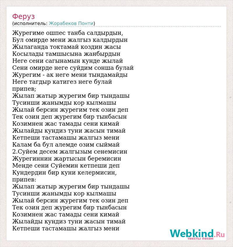 Журегиме ошпес танба салдырдын, Бул омирде мени жалгыз калдырдын Жылаганда токтамай коздин жасы Косылады тамшысына жанбырдын Неге сени сагынамын кунде жылай Сени омирде неге суйдим сонша булай Журегим - ак неге мени тындамайды Неге тагдыр катигез неге булай припев; Жылап жатыр журегим бир тындашы Тусинши жанымды кор кылмашы Жылай берсин журегим тек озин деп Тек озин деп журегим бир тынбасын Козимнен жас тамады сени кимай Жылайды кундиз туни жасын тимай Кетпеши тастамашы жалгыз мени Калам ба бул алемде озим сыймай 2.Суйем десем жалгызым сенемисин Журегиннин жартысын беремисин Менде сени Суйемин кетпеши деп Кундердин бир куни келермисин, припев: Жылап жатыр журегим бир тындашы Тусинши жанымды кор кылмашы Жылай берсин журегим тек озин деп Тек озин деп журегим бир тынбасын Козимнен жас тамады сени кимай Жылайды кундиз туни жасын тимай Кетпеши тастамашы жалгыз мени