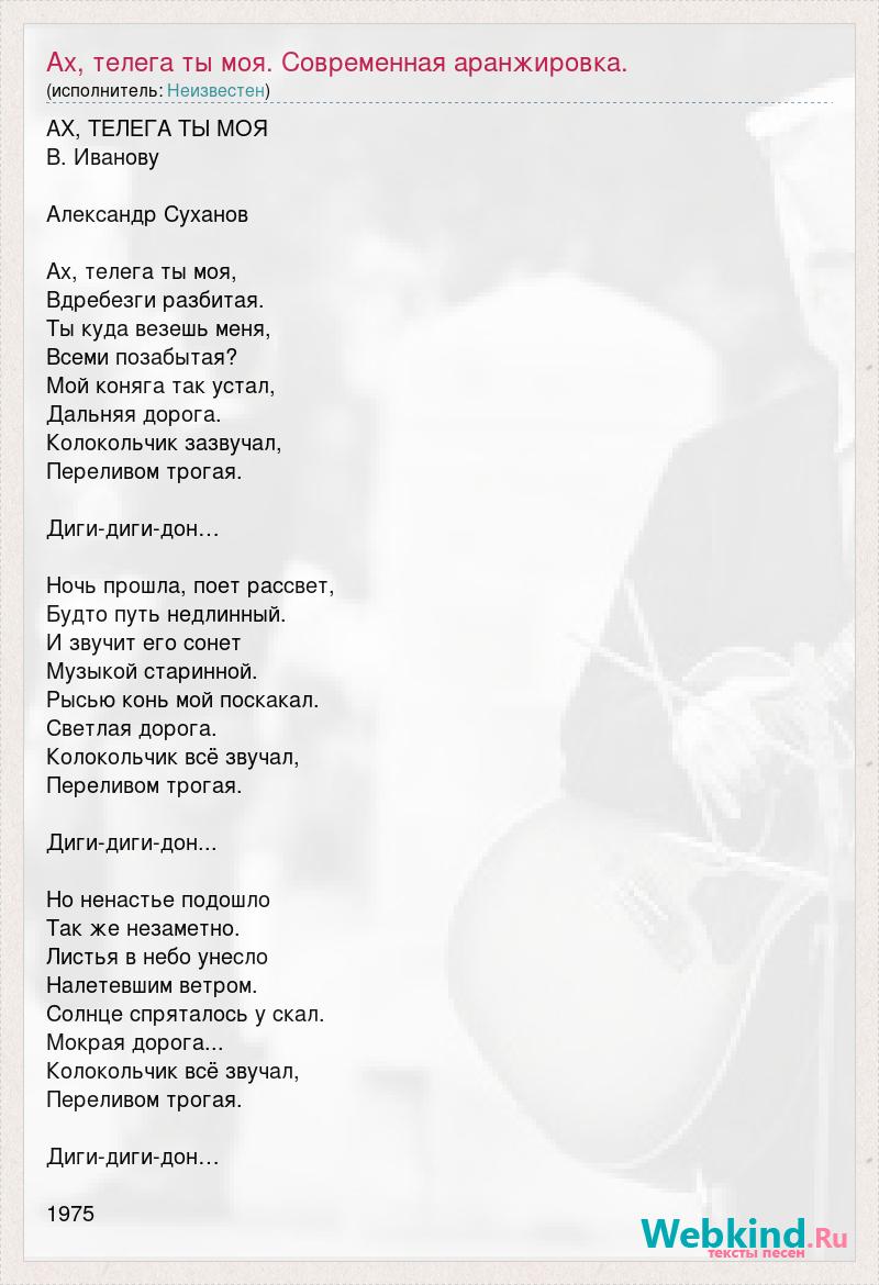 АХ, ТЕЛЕГА ТЫ МОЯ В. Иванову Александр Суханов Ах, телега ты моя, Вдребезги разбитая. Ты куда везешь меня, Всеми позабытая? Мой коняга так устал, Дальняя дорога. Колокольчик зазвучал, Переливом трогая. Диги-диги-дон… Ночь прошла, поет рассвет, Будто путь недлинный. И звучит его сонет Музыкой старинной. Рысью конь мой поскакал. Светлая дорога. Колокольчик всё звучал, Переливом трогая. Диги-диги-дон... Но ненастье подошло Так же незаметно. Листья в небо унесло Налетевшим ветром. Солнце спряталось у скал. Мокрая дорога... Колокольчик всё звучал, Переливом трогая. Диги-диги-дон… 1975