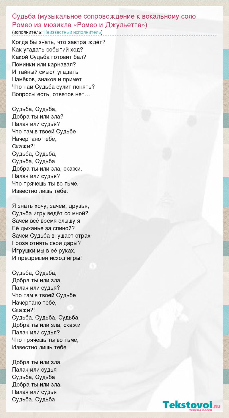 Когда бы знать, что завтра ждёт? Как угадать событий ход? Какой Судьба готовит бал? Поминки или карнавал? И тайный смысл угадать Намёков, знаков и примет Что нам Судьба сулит понять? Вопросы есть, ответов нет… Судьба, Судьба, Добра ты или зла? Палач или судья? Что там в твоей Судьбе Начертано тебе, Скажи?! Судьба, Судьба, Судьба, Судьба Добра ты или зла, скажи. Палач или судья? Что прячешь ты во тьме, Известно лишь тебе. Я знать хочу, зачем, друзья, Судьба игру ведёт со мной? Зачем всё время слышу я Её дыханье за спиной? Зачем Судьба внушает страх Грозя отнять свои дары? Игрушки мы в её руках, И предрешён исход игры! Судьба, Судьба, Добра ты или зла, Палач или судья? Что там в твоей Судьбе Начертано тебе, Скажи?! Судьба, Судьба, Судьба, Добра ты или зла, скажи Палач или судья? Что прячешь ты во тьме, Известно лишь тебе. Добра ты или зла, Палач или судья Судьба, Судьба Добра ты или зла, Палач или судья Судьба, Судьба