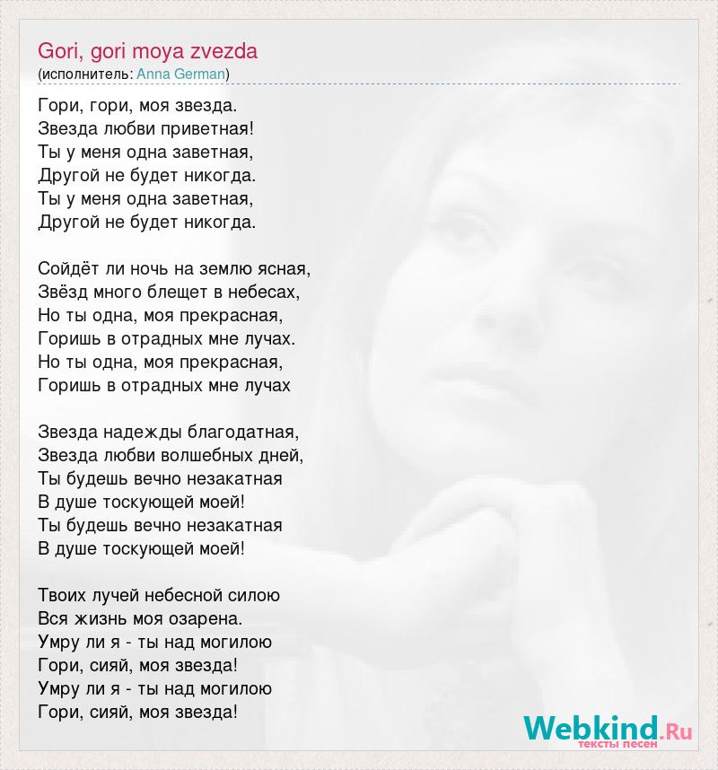 Гори, гори, моя звезда. Звезда любви приветная! Ты у меня одна заветная, Другой не будет никогда. Ты у меня одна заветная, Другой не будет никогда. Сойдёт ли ночь на землю ясная, Звёзд много блещет в небесах, Но ты одна, моя прекрасная, Горишь в отрадных мне лучах. Но ты одна, моя прекрасная, Горишь в отрадных мне лучах Звезда надежды благодатная, Звезда любви волшебных дней, Ты будешь вечно незакатная В душе тоскующей моей! Ты будешь вечно незакатная В душе тоскующей моей! Твоих лучей небесной силою Вся жизнь моя озарена. Умру ли я - ты над могилою Гори, сияй, моя звезда! Умру ли я - ты над могилою Гори, сияй, моя звезда!