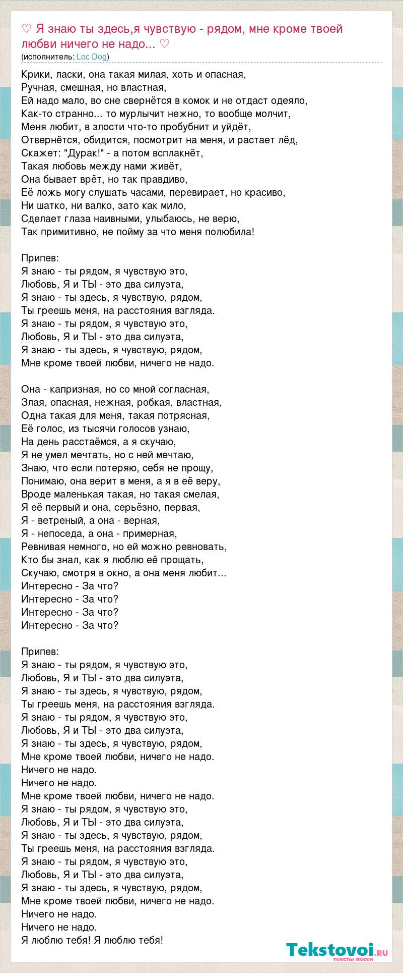 Крики, ласки, она такая милая, хоть и опасная, Ручная, смешная, но властная, Ей надо мало, во сне свернётся в комок и не отдаст одеяло, Как-то странно... то мурлычит нежно, то вообще молчит, Меня любит, в злости что-то пробубнит и уйдёт, Отвернётся, обидится, посмотрит на меня, и растает лёд, Скажет: "Дурак!" - а потом всплакнёт, Такая любовь между нами живёт, Она бывает врёт, но так правдиво, Её ложь могу слушать часами, перевирает, но красиво, Ни шатко, ни валко, зато как мило, Сделает глаза наивными, улыбаюсь, не верю, Так примитивно, не пойму за что меня полюбила! Припев: Я знаю - ты рядом, я чувствую это, Любовь, Я и ТЫ - это два силуэта, Я знаю - ты здесь, я чувствую, рядом, Ты греешь меня, на расстояния взгляда. Я знаю - ты рядом, я чувствую это, Любовь, Я и ТЫ - это два силуэта, Я знаю - ты здесь, я чувствую, рядом, Мне кроме твоей любви, ничего не надо. Она - капризная, но со мной согласная, Злая, опасная, нежная, робкая, властная, Одна такая для меня, такая потрясная, Её голос, из тысячи голосов узнаю, На день расстаёмся, а я скучаю, Я не умел мечтать, но с ней мечтаю, Знаю, что если потеряю, себя не прощу, Понимаю, она верит в меня, а я в её веру, Вроде маленькая такая, но такая смелая, Я её первый и она, серьёзно, первая, Я - ветреный, а она - верная, Я - непоседа, а она - примерная, Ревнивая немного, но ей можно ревновать, Кто бы знал, как я люблю её прощать, Скучаю, смотря в окно, а она меня любит... Интересно - За что? Интересно - За что? Интересно - За что? Интересно - За что? Припев: Я знаю - ты рядом, я чувствую это, Любовь, Я и ТЫ - это два силуэта, Я знаю - ты здесь, я чувствую, рядом, Ты греешь меня, на расстояния взгляда. Я знаю - ты рядом, я чувствую это, Любовь, Я и ТЫ - это два силуэта, Я знаю - ты здесь, я чувствую, рядом, Мне кроме твоей любви, ничего не надо. Ничего не надо. Ничего не надо. Мне кроме твоей любви, ничего не надо. Я знаю - ты рядом, я чувствую это, Любовь, Я и ТЫ - это два силуэта, Я знаю - ты здесь, я чувствую, рядом, Ты греешь меня, на расстояния взгляда. Я знаю - ты рядом, я чувствую это, Любовь, Я и ТЫ - это два силуэта, Я знаю - ты здесь, я чувствую, рядом, Мне кроме твоей любви, ничего не надо. Ничего не надо. Ничего не надо. Я люблю тебя! Я люблю тебя!
