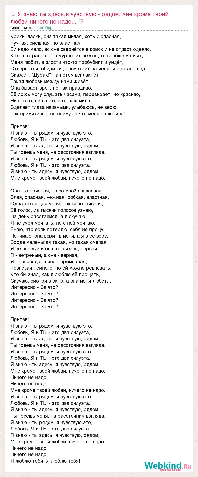 Крики, ласки, она такая милая, хоть и опасная, Ручная, смешная, но властная, Ей надо мало, во сне свернётся в комок и не отдаст одеяло, Как-то странно... то мурлычит нежно, то вообще молчит, Меня любит, в злости что-то пробубнит и уйдёт, Отвернётся, обидится, посмотрит на меня, и растает лёд, Скажет: "Дурак!" - а потом всплакнёт, Такая любовь между нами живёт, Она бывает врёт, но так правдиво, Её ложь могу слушать часами, перевирает, но красиво, Ни шатко, ни валко, зато как мило, Сделает глаза наивными, улыбаюсь, не верю, Так примитивно, не пойму за что меня полюбила! Припев: Я знаю - ты рядом, я чувствую это, Любовь, Я и ТЫ - это два силуэта, Я знаю - ты здесь, я чувствую, рядом, Ты греешь меня, на расстояния взгляда. Я знаю - ты рядом, я чувствую это, Любовь, Я и ТЫ - это два силуэта, Я знаю - ты здесь, я чувствую, рядом, Мне кроме твоей любви, ничего не надо. Она - капризная, но со мной согласная, Злая, опасная, нежная, робкая, властная, Одна такая для меня, такая потрясная, Её голос, из тысячи голосов узнаю, На день расстаёмся, а я скучаю, Я не умел мечтать, но с ней мечтаю, Знаю, что если потеряю, себя не прощу, Понимаю, она верит в меня, а я в её веру, Вроде маленькая такая, но такая смелая, Я её первый и она, серьёзно, первая, Я - ветреный, а она - верная, Я - непоседа, а она - примерная, Ревнивая немного, но ей можно ревновать, Кто бы знал, как я люблю её прощать, Скучаю, смотря в окно, а она меня любит... Интересно - За что? Интересно - За что? Интересно - За что? Интересно - За что? Припев: Я знаю - ты рядом, я чувствую это, Любовь, Я и ТЫ - это два силуэта, Я знаю - ты здесь, я чувствую, рядом, Ты греешь меня, на расстояния взгляда. Я знаю - ты рядом, я чувствую это, Любовь, Я и ТЫ - это два силуэта, Я знаю - ты здесь, я чувствую, рядом, Мне кроме твоей любви, ничего не надо. Ничего не надо. Ничего не надо. Мне кроме твоей любви, ничего не надо. Я знаю - ты рядом, я чувствую это, Любовь, Я и ТЫ - это два силуэта, Я знаю - ты здесь, я чувствую, рядом, Ты греешь меня, на расстояния взгляда. Я знаю - ты рядом, я чувствую это, Любовь, Я и ТЫ - это два силуэта, Я знаю - ты здесь, я чувствую, рядом, Мне кроме твоей любви, ничего не надо. Ничего не надо. Ничего не надо. Я люблю тебя! Я люблю тебя!