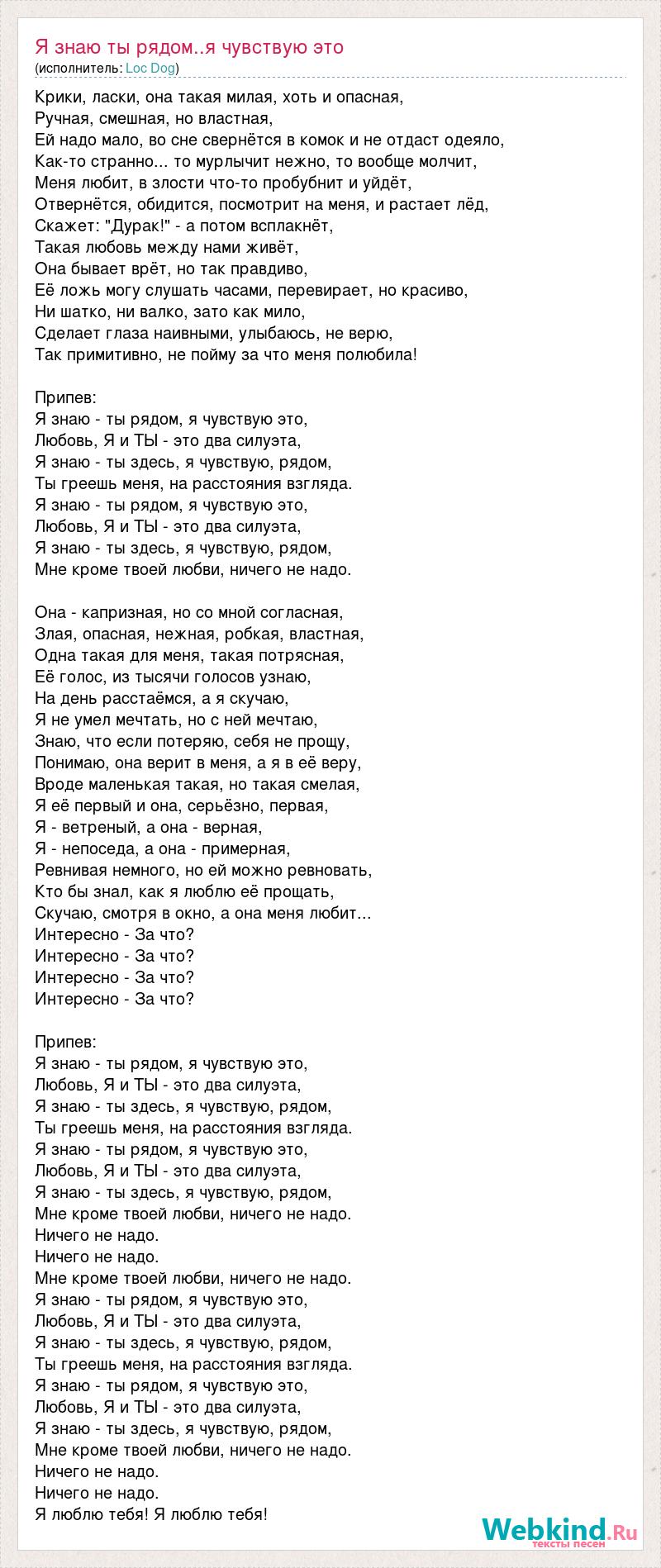 Крики, ласки, она такая милая, хоть и опасная, Ручная, смешная, но властная, Ей надо мало, во сне свернётся в комок и не отдаст одеяло, Как-то странно... то мурлычит нежно, то вообще молчит, Меня любит, в злости что-то пробубнит и уйдёт, Отвернётся, обидится, посмотрит на меня, и растает лёд, Скажет: "Дурак!" - а потом всплакнёт, Такая любовь между нами живёт, Она бывает врёт, но так правдиво, Её ложь могу слушать часами, перевирает, но красиво, Ни шатко, ни валко, зато как мило, Сделает глаза наивными, улыбаюсь, не верю, Так примитивно, не пойму за что меня полюбила! Припев: Я знаю - ты рядом, я чувствую это, Любовь, Я и ТЫ - это два силуэта, Я знаю - ты здесь, я чувствую, рядом, Ты греешь меня, на расстояния взгляда. Я знаю - ты рядом, я чувствую это, Любовь, Я и ТЫ - это два силуэта, Я знаю - ты здесь, я чувствую, рядом, Мне кроме твоей любви, ничего не надо. Она - капризная, но со мной согласная, Злая, опасная, нежная, робкая, властная, Одна такая для меня, такая потрясная, Её голос, из тысячи голосов узнаю, На день расстаёмся, а я скучаю, Я не умел мечтать, но с ней мечтаю, Знаю, что если потеряю, себя не прощу, Понимаю, она верит в меня, а я в её веру, Вроде маленькая такая, но такая смелая, Я её первый и она, серьёзно, первая, Я - ветреный, а она - верная, Я - непоседа, а она - примерная, Ревнивая немного, но ей можно ревновать, Кто бы знал, как я люблю её прощать, Скучаю, смотря в окно, а она меня любит... Интересно - За что? Интересно - За что? Интересно - За что? Интересно - За что? Припев: Я знаю - ты рядом, я чувствую это, Любовь, Я и ТЫ - это два силуэта, Я знаю - ты здесь, я чувствую, рядом, Ты греешь меня, на расстояния взгляда. Я знаю - ты рядом, я чувствую это, Любовь, Я и ТЫ - это два силуэта, Я знаю - ты здесь, я чувствую, рядом, Мне кроме твоей любви, ничего не надо. Ничего не надо. Ничего не надо. Мне кроме твоей любви, ничего не надо. Я знаю - ты рядом, я чувствую это, Любовь, Я и ТЫ - это два силуэта, Я знаю - ты здесь, я чувствую, рядом, Ты греешь меня, на расстояния взгляда. Я знаю - ты рядом, я чувствую это, Любовь, Я и ТЫ - это два силуэта, Я знаю - ты здесь, я чувствую, рядом, Мне кроме твоей любви, ничего не надо. Ничего не надо. Ничего не надо. Я люблю тебя! Я люблю тебя!