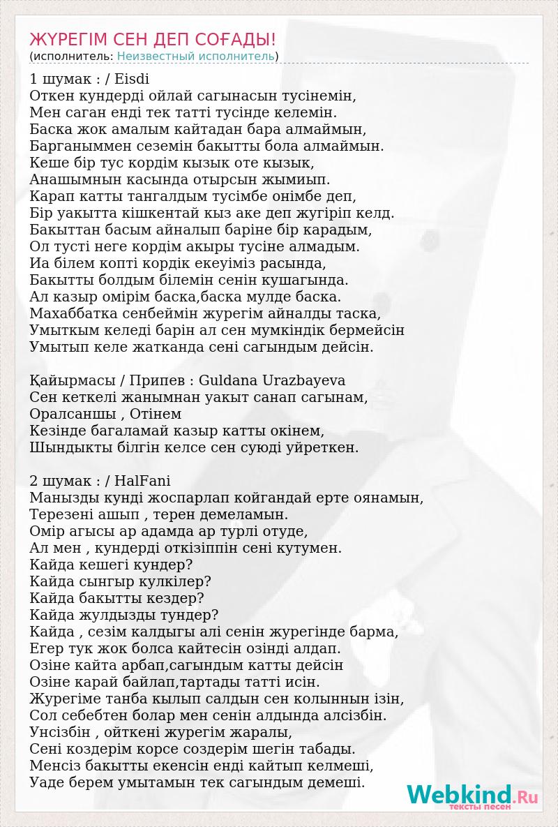1 шумак : / Eisdi Откен кундердi ойлай сагынасын тусiнемiн, Мен саган ендi тек таттi тусiнде келемiн. Баска жок амалым кайтадан бара алмаймын, Барганыммен сеземiн бакытты бола алмаймын. Кеше бiр тус кордiм кызык оте кызык, Анашымнын касында отырсын жымиып. Карап катты тангалдым тусiмбе онiмбе деп, Бiр уакытта кiшкентай кыз аке деп жугiрiп келд. Бакыттан басым айналып барiне бiр карадым, Ол тустi неге кордiм акыры тусiне алмадым. Иа бiлем коптi кордiк екеуiмiз расында, Бакытты болдым бiлемiн сенiн кушагында. Ал казыр омiрiм баска,баска мулде баска. Махаббатка сенбеймiн журегiм айналды таска, Умыткым келедi барiн ал сен мумкiндiк бермейсiн Умытып келе жатканда сенi сагындым дейсiн. Қайырмасы / Припев : Guldana Urazbayeva Cен кеткелi жанымнан уакыт санап сагынам, Оралсаншы , Отiнем Кезiнде багаламай казыр катты окiнем, Шындыкты бiлгiн келсе сен суюдi уйреткен. 2 шумак : / HalFani Манызды кундi жоспарлап койгандай ерте оянамын, Терезенi ашып , терен демеламын. Омiр агысы ар адамда ар турлi отуде, Ал мен , кундердi откiзiппiн сенi кутумен. Кайда кешегi кундер? Кайда сынгыр кулкiлер? Кайда бакытты кездер? Кайда жулдызды тундер? Кайда , сезiм калдыгы алi сенiн журегiнде барма, Егер тук жок болса кайтесiн озiндi алдап. Озiне кайта арбап,сагындым катты дейсiн Озiне карай байлап,тартады таттi исiн. Журегiме танба кылып салдын сен колыннын iзiн, Сол себебтен болар мен сенiн алдында алсiзбiн. Унсiзбiн , ойткенi журегiм жаралы, Сенi коздерiм корсе создерiм шегiн табады. Менсiз бакытты екенсiн ендi кайтып келмешi, Уаде берем умытамын тек сагындым демешi.