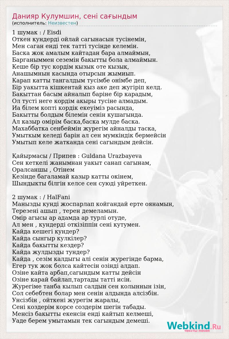 1 шумак : / Eisdi Откен кундердi ойлай сагынасын тусiнемiн, Мен саган ендi тек таттi тусiнде келемiн. Баска жок амалым кайтадан бара алмаймын, Барганыммен сеземiн бакытты бола алмаймын. Кеше бiр тус кордiм кызык оте кызык, Анашымнын касында отырсын жымиып. Карап катты тангалдым тусiмбе онiмбе деп, Бiр уакытта кiшкентай кыз аке деп жугiрiп келд. Бакыттан басым айналып барiне бiр карадым, Ол тустi неге кордiм акыры тусiне алмадым. Иа бiлем коптi кордiк екеуiмiз расында, Бакытты болдым бiлемiн сенiн кушагында. Ал казыр омiрiм баска,баска мулде баска. Махаббатка сенбеймiн журегiм айналды таска, Умыткым келедi барiн ал сен мумкiндiк бермейсiн Умытып келе жатканда сенi сагындым дейсiн. Қайырмасы / Припев : Guldana Urazbayeva Cен кеткелi жанымнан уакыт санап сагынам, Оралсаншы , Отiнем Кезiнде багаламай казыр катты окiнем, Шындыкты бiлгiн келсе сен суюдi уйреткен. 2 шумак : / HalFani Манызды кундi жоспарлап койгандай ерте оянамын, Терезенi ашып , терен демеламын. Омiр агысы ар адамда ар турлi отуде, Ал мен , кундердi откiзiппiн сенi кутумен. Кайда кешегi кундер? Кайда сынгыр кулкiлер? Кайда бакытты кездер? Кайда жулдызды тундер? Кайда , сезiм калдыгы алi сенiн журегiнде барма, Егер тук жок болса кайтесiн озiндi алдап. Озiне кайта арбап,сагындым катты дейсiн Озiне карай байлап,тартады таттi исiн. Журегiме танба кылып салдын сен колыннын iзiн, Сол себебтен болар мен сенiн алдында алсiзбiн. Унсiзбiн , ойткенi журегiм жаралы, Сенi коздерiм корсе создерiм шегiн табады. Менсiз бакытты екенсiн ендi кайтып келмешi, Уаде берем умытамын тек сагындым демешi.