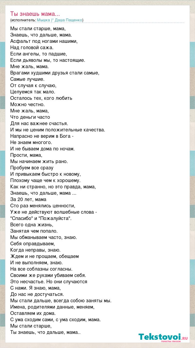Мы стали старше, мама, Знаешь, что дальше, мама. Асфальт под ногами нашими, Над головой сажа. Если ангелы, то падшие, Если дьяволы мы, то настоящие. Мне жаль, мама. Врагами худшими друзья стали самые, Самые лучшие. От случая к случаю, Целуемся так мало. Осталось тех, кого любить Можно честно. Мне жаль, мама, Что деньги часто Для нас важнее счастья. И мы не ценим положительные качества. Напрасно не верим в Бога - Не знаем многого. И не бываем дома по ночам. Прости, мама, Мы начинаем жить рано. Пробуем все сразу И привыкаем быстро к новому, Плохому чаще чем к хорошему. Как ни странно, но это правда, мама, Знаешь, что дальше, мама ... За 20 лет, мама Сто раз менялись ценности, Уже не действуют волшебные слова - "Спасибо" и "Пожалуйста". Всего одна жизнь, Занятая чем попало. Мы обманываем часто, знаю. Себя оправдываем, Когда неправы, знаю. Ждем и не прощаем, обещаем И не выполняем, знаю. На все соблазны согласны. Своими же руками убиваем себя. Это несчастье. Но они случаются С нами. Я знаю, мама, До нас не достучаться. Мы стали дальше, всегда собою заняты мы. Имена, родителями данные, меняем, Оставляем их дома. С ума сходим сами, с ума сходим, мама. Мы стали старше, Ты знаешь, что дальше, мама..