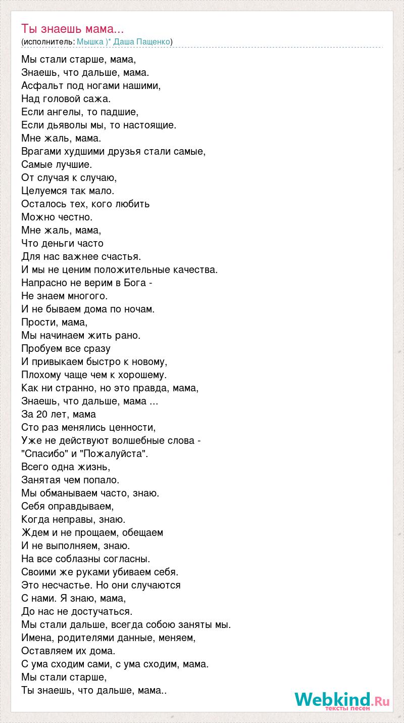 Мы стали старше, мама, Знаешь, что дальше, мама. Асфальт под ногами нашими, Над головой сажа. Если ангелы, то падшие, Если дьяволы мы, то настоящие. Мне жаль, мама. Врагами худшими друзья стали самые, Самые лучшие. От случая к случаю, Целуемся так мало. Осталось тех, кого любить Можно честно. Мне жаль, мама, Что деньги часто Для нас важнее счастья. И мы не ценим положительные качества. Напрасно не верим в Бога - Не знаем многого. И не бываем дома по ночам. Прости, мама, Мы начинаем жить рано. Пробуем все сразу И привыкаем быстро к новому, Плохому чаще чем к хорошему. Как ни странно, но это правда, мама, Знаешь, что дальше, мама ... За 20 лет, мама Сто раз менялись ценности, Уже не действуют волшебные слова - "Спасибо" и "Пожалуйста". Всего одна жизнь, Занятая чем попало. Мы обманываем часто, знаю. Себя оправдываем, Когда неправы, знаю. Ждем и не прощаем, обещаем И не выполняем, знаю. На все соблазны согласны. Своими же руками убиваем себя. Это несчастье. Но они случаются С нами. Я знаю, мама, До нас не достучаться. Мы стали дальше, всегда собою заняты мы. Имена, родителями данные, меняем, Оставляем их дома. С ума сходим сами, с ума сходим, мама. Мы стали старше, Ты знаешь, что дальше, мама..