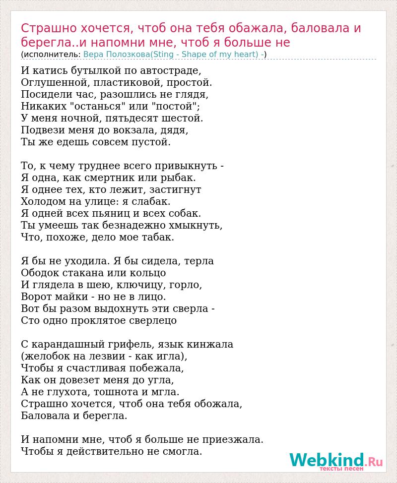 Главная→Исполнители→Вера Полозкова(Sting - Shape of my heart) -→Страшно хочется, чтоб она тебя обажала, баловала и берегла..и напомни м