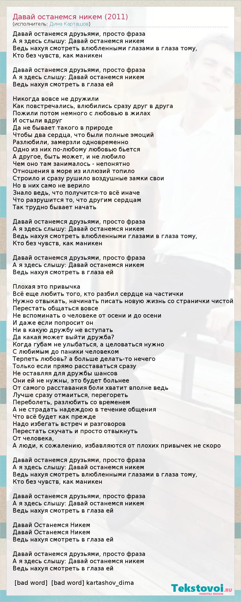 Давай останемся друзьями, просто фраза А я здесь слышу: Давай останемся никем Ведь нахуя смотреть влюбленными глазами в глаза тому, Кто без чувств, как маникен Давай останемся друзьями, просто фраза А я здесь слышу: Давай останемся никем Ведь нахуя смотреть в глаза ей Никогда вовсе не дружили Как повстречались, влюбились сразу друг в друга Пожили потом немного с любовью в жилах И остыли вдруг Да не бывает такого в природе Чтобы два сердца, что были полные эмоций Разлюбили, замерзли одновременно Одно из них по-любому любовью бьется А другое, быть может, и не любило Чем оно там занималось - непонятно Отношения в море из иллюзий топило Строило и сразу рушило воздушные замки свои Но в них само не верило Знало ведь, что получится-то всё иначе Что разрушится то, что другим сердцам Так трудно бывает начать Давай останемся друзьями, просто фраза А я здесь слышу: Давай останемся никем Ведь нахуя смотреть влюбленными глазами в глаза тому, Кто без чувств, как маникен Давай останемся друзьями, просто фраза А я здесь слышу: Давай останемся никем Ведь нахуя смотреть в глаза ей Плохая это привычка Всё еще любить того, кто разбил сердце на частички Нужно отвыкать, начинать писать новую жизнь со странички чистой Перестать общаться вовсе Не вспоминать о человеке от осени и до осени И даже если попросит он Ни в какую дружбу не вступать Да какая может выйти дружба? Когда губам не улыбаться, а целоваться нужно С любимым до паники человеком Терпеть любовь? а больше делать-то нечего Только если прямо расставаться сразу Не оставляя для дружбы шансов Они ей не нужны, это будет больнее От самого расставания боли хватит вполне ведь Лучше сразу отмаиться, перегореть Переболеть, разлюбить со временем А не страдать надеждою в течение общения Что всё будет как прежде Надо избегать встреч и разговоров Перестать скучать и просто отвыкнуть От человека, А люди, к сожалению, избавляются от плохих привычек не скоро Давай останемся друзьями, просто фраза А я здесь слышу: Давай останемся никем Ведь нахуя смотреть влюбленными глазами в глаза тому, Кто без чувств, как маникен Давай останемся друзьями, просто фраза А я здесь слышу: Давай останемся никем Ведь нахуя смотреть в глаза ей Давай Останемся Никем Давай Останемся Никем Ведь нахуя смотреть в глаза ей Давай останемся друзьями, просто фраза А я здесь слышу: Давай останемся никем Ведь нахуя смотреть в глаза ей [bad word] [bad word] kartashov_dima
