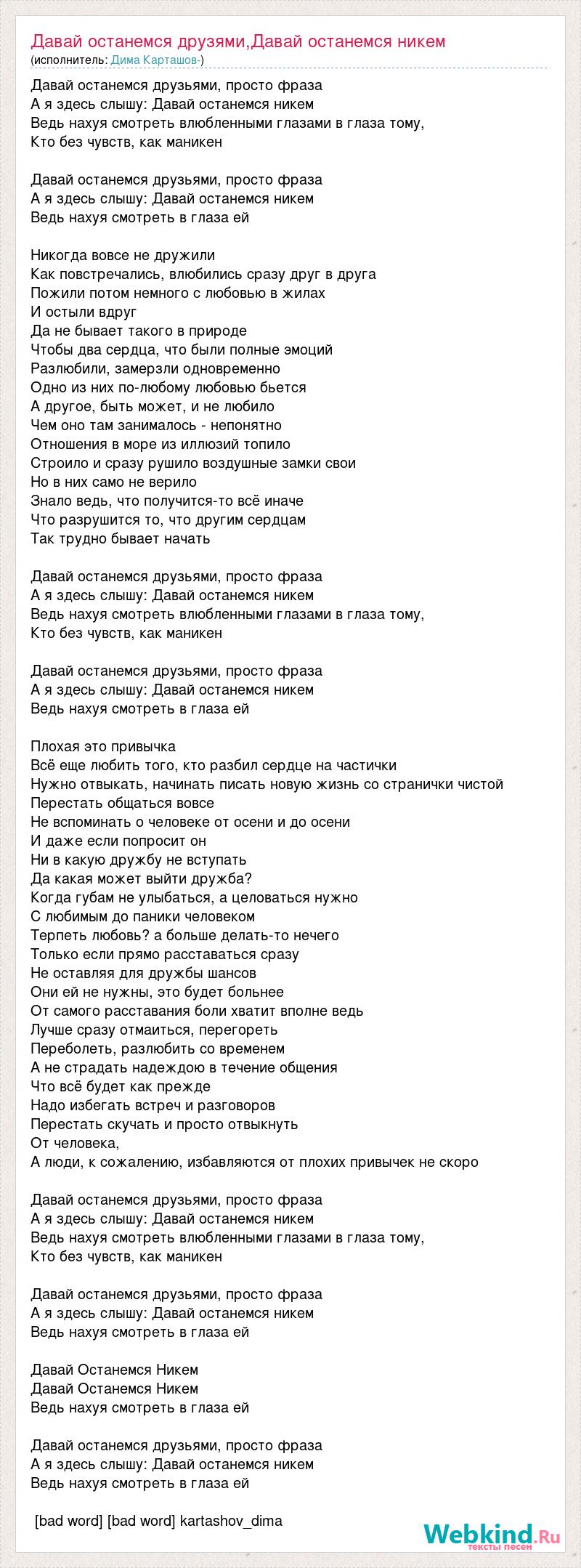 Давай останемся друзьями, просто фраза А я здесь слышу: Давай останемся никем Ведь нахуя смотреть влюбленными глазами в глаза тому, Кто без чувств, как маникен Давай останемся друзьями, просто фраза А я здесь слышу: Давай останемся никем Ведь нахуя смотреть в глаза ей Никогда вовсе не дружили Как повстречались, влюбились сразу друг в друга Пожили потом немного с любовью в жилах И остыли вдруг Да не бывает такого в природе Чтобы два сердца, что были полные эмоций Разлюбили, замерзли одновременно Одно из них по-любому любовью бьется А другое, быть может, и не любило Чем оно там занималось - непонятно Отношения в море из иллюзий топило Строило и сразу рушило воздушные замки свои Но в них само не верило Знало ведь, что получится-то всё иначе Что разрушится то, что другим сердцам Так трудно бывает начать Давай останемся друзьями, просто фраза А я здесь слышу: Давай останемся никем Ведь нахуя смотреть влюбленными глазами в глаза тому, Кто без чувств, как маникен Давай останемся друзьями, просто фраза А я здесь слышу: Давай останемся никем Ведь нахуя смотреть в глаза ей Плохая это привычка Всё еще любить того, кто разбил сердце на частички Нужно отвыкать, начинать писать новую жизнь со странички чистой Перестать общаться вовсе Не вспоминать о человеке от осени и до осени И даже если попросит он Ни в какую дружбу не вступать Да какая может выйти дружба? Когда губам не улыбаться, а целоваться нужно С любимым до паники человеком Терпеть любовь? а больше делать-то нечего Только если прямо расставаться сразу Не оставляя для дружбы шансов Они ей не нужны, это будет больнее От самого расставания боли хватит вполне ведь Лучше сразу отмаиться, перегореть Переболеть, разлюбить со временем А не страдать надеждою в течение общения Что всё будет как прежде Надо избегать встреч и разговоров Перестать скучать и просто отвыкнуть От человека, А люди, к сожалению, избавляются от плохих привычек не скоро Давай останемся друзьями, просто фраза А я здесь слышу: Давай останемся никем Ведь нахуя смотреть влюбленными глазами в глаза тому, Кто без чувств, как маникен Давай останемся друзьями, просто фраза А я здесь слышу: Давай останемся никем Ведь нахуя смотреть в глаза ей Давай Останемся Никем Давай Останемся Никем Ведь нахуя смотреть в глаза ей Давай останемся друзьями, просто фраза А я здесь слышу: Давай останемся никем Ведь нахуя смотреть в глаза ей [bad word] [bad word] kartashov_dima