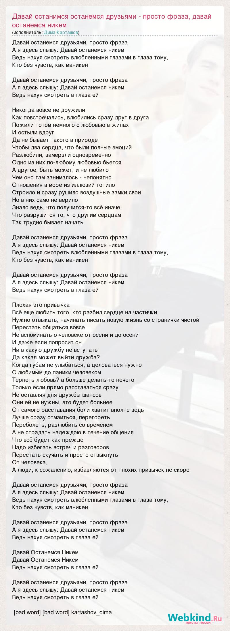 Давай останемся друзьями, просто фраза А я здесь слышу: Давай останемся никем Ведь нахуя смотреть влюбленными глазами в глаза тому, Кто без чувств, как маникен Давай останемся друзьями, просто фраза А я здесь слышу: Давай останемся никем Ведь нахуя смотреть в глаза ей Никогда вовсе не дружили Как повстречались, влюбились сразу друг в друга Пожили потом немного с любовью в жилах И остыли вдруг Да не бывает такого в природе Чтобы два сердца, что были полные эмоций Разлюбили, замерзли одновременно Одно из них по-любому любовью бьется А другое, быть может, и не любило Чем оно там занималось - непонятно Отношения в море из иллюзий топило Строило и сразу рушило воздушные замки свои Но в них само не верило Знало ведь, что получится-то всё иначе Что разрушится то, что другим сердцам Так трудно бывает начать Давай останемся друзьями, просто фраза А я здесь слышу: Давай останемся никем Ведь нахуя смотреть влюбленными глазами в глаза тому, Кто без чувств, как маникен Давай останемся друзьями, просто фраза А я здесь слышу: Давай останемся никем Ведь нахуя смотреть в глаза ей Плохая это привычка Всё еще любить того, кто разбил сердце на частички Нужно отвыкать, начинать писать новую жизнь со странички чистой Перестать общаться вовсе Не вспоминать о человеке от осени и до осени И даже если попросит он Ни в какую дружбу не вступать Да какая может выйти дружба? Когда губам не улыбаться, а целоваться нужно С любимым до паники человеком Терпеть любовь? а больше делать-то нечего Только если прямо расставаться сразу Не оставляя для дружбы шансов Они ей не нужны, это будет больнее От самого расставания боли хватит вполне ведь Лучше сразу отмаиться, перегореть Переболеть, разлюбить со временем А не страдать надеждою в течение общения Что всё будет как прежде Надо избегать встреч и разговоров Перестать скучать и просто отвыкнуть От человека, А люди, к сожалению, избавляются от плохих привычек не скоро Давай останемся друзьями, просто фраза А я здесь слышу: Давай останемся никем Ведь нахуя смотреть влюбленными глазами в глаза тому, Кто без чувств, как маникен Давай останемся друзьями, просто фраза А я здесь слышу: Давай останемся никем Ведь нахуя смотреть в глаза ей Давай Останемся Никем Давай Останемся Никем Ведь нахуя смотреть в глаза ей Давай останемся друзьями, просто фраза А я здесь слышу: Давай останемся никем Ведь нахуя смотреть в глаза ей [bad word] [bad word] kartashov_dima