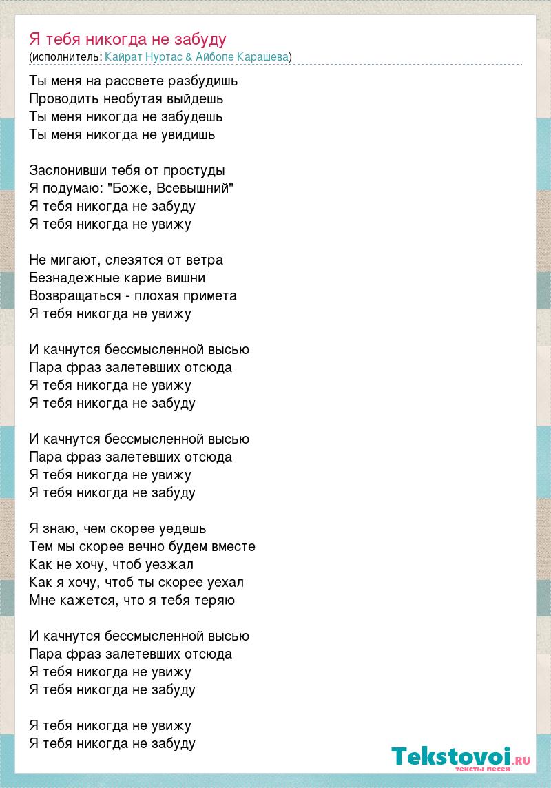 Ты меня на рассвете разбудишь Проводить необутая выйдешь Ты меня никогда не забудешь Ты меня никогда не увидишь Заслонивши тебя от простуды Я подумаю: "Боже, Всевышний" Я тебя никогда не забуду Я тебя никогда не увижу Не мигают, слезятся от ветра Безнадежные карие вишни Возвращаться - плохая примета Я тебя никогда не увижу И качнутся бессмысленной высью Пара фраз залетевших отсюда Я тебя никогда не увижу Я тебя никогда не забуду И качнутся бессмысленной высью Пара фраз залетевших отсюда Я тебя никогда не увижу Я тебя никогда не забуду Я знаю, чем скорее уедешь Тем мы скорее вечно будем вместе Как не хочу, чтоб уезжал Как я хочу, чтоб ты скорее уехал Мне кажется, что я тебя теряю И качнутся бессмысленной высью Пара фраз залетевших отсюда Я тебя никогда не увижу Я тебя никогда не забуду Я тебя никогда не увижу Я тебя никогда не забуду