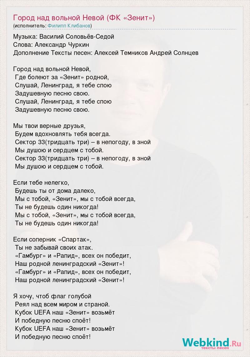 Музыка: Василий Соловьёв-Седой Слова: Александр Чуркин Дополнение Тексты песен: Алексей Темников Андрей Солнцев Город над вольной Невой, Где болеют за «Зенит» родной, Слушай, Ленинград, я тебе спою Задушевную песню свою. Слушай, Ленинград, я тебе спою Задушевную песню свою. Мы твои верные друзья, Будем вдохновлять тебя всегда. Сектор 33(тридцать три) – в непогоду, в зной Мы душою и сердцем с тобой. Сектор 33(тридцать три) – в непогоду, в зной Мы душою и сердцем с тобой. Если тебе нелегко, Будешь ты от дома далеко, Мы с тобой, «Зенит», мы с тобой всегда, Ты не будешь один никогда! Мы с тобой, «Зенит», мы с тобой всегда, Ты не будешь один никогда! Если соперник «Спартак», Ты не забывай своих атак. «Гамбург» и «Рапид», всех он победит, Наш родной ленинградский «Зенит»! «Гамбург» и «Рапид», всех он победит, Наш родной ленинградский «Зенит»! Я хочу, чтоб флаг голубой Реял над всем миром и страной. Кубок UEFA наш «Зенит» возьмёт И победную песню споёт! Кубок UEFA наш «Зенит» возьмёт И победную песню споёт!