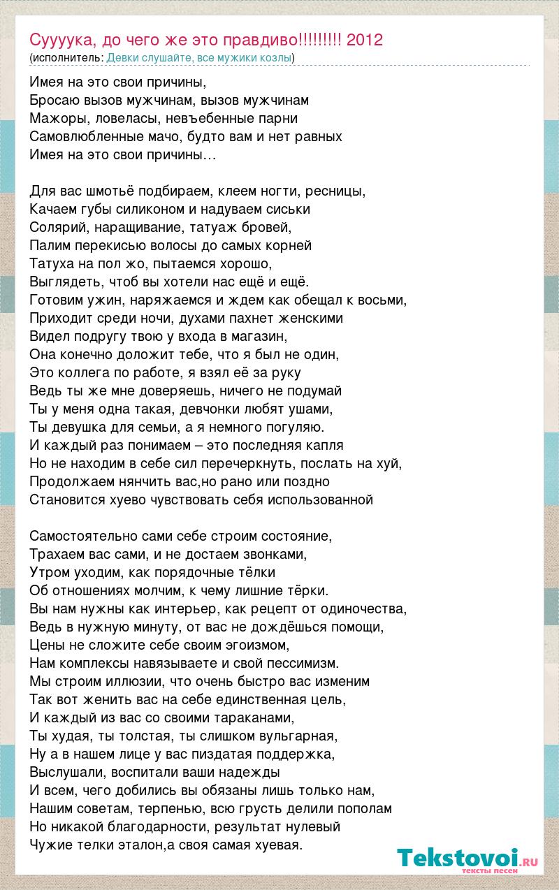 Имея на это свои причины, Бросаю вызов мужчинам, вызов мужчинам Мажоры, ловеласы, невъебенные парни Самовлюбленные мачо, будто вам и нет равных Имея на это свои причины… Для вас шмотьё подбираем, клеем ногти, ресницы, Качаем губы силиконом и надуваем сиськи Солярий, наращивание, татуаж бровей, Палим перекисью волосы до самых корней Татуха на пол жо, пытаемся хорошо, Выглядеть, чтоб вы хотели нас ещё и ещё. Готовим ужин, наряжаемся и ждем как обещал к восьми, Приходит среди ночи, духами пахнет женскими Видел подругу твою у входа в магазин, Она конечно доложит тебе, что я был не один, Это коллега по работе, я взял её за руку Ведь ты же мне доверяешь, ничего не подумай Ты у меня одна такая, девчонки любят ушами, Ты девушка для семьи, а я немного погуляю. И каждый раз понимаем – это последняя капля Но не находим в себе сил перечеркнуть, послать на хуй, Продолжаем нянчить вас,но рано или поздно Становится хуево чувствовать себя использованной Самостоятельно сами себе строим состояние, Трахаем вас сами, и не достаем звонками, Утром уходим, как порядочные тёлки Об отношениях молчим, к чему лишние тёрки. Вы нам нужны как интерьер, как рецепт от одиночества, Ведь в нужную минуту, от вас не дождёшься помощи, Цены не сложите себе своим эгоизмом, Нам комплексы навязываете и свой пессимизм. Мы строим иллюзии, что очень быстро вас изменим Так вот женить вас на себе единственная цель, И каждый из вас со своими тараканами, Ты худая, ты толстая, ты слишком вульгарная, Ну а в нашем лице у вас пиздатая поддержка, Выслушали, воспитали ваши надежды И всем, чего добились вы обязаны лишь только нам, Нашим советам, терпенью, всю грусть делили пополам Но никакой благодарности, результат нулевый Чужие телки эталон,а своя самая хуевая.