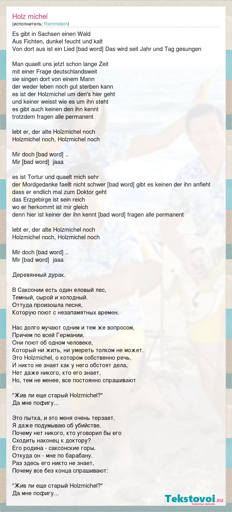 Es gibt in Sachsen einen Wald Aus Fichten, dunkel feucht und kalt Von dort aus ist ein Lied entsprungen Das wird seit Jahr und Tag gesungen Man quaelt uns jetzt schon lange Zeit mit einer Frage deutschlandsweit sie singen dort von einem Mann der weder leben noch gut sterben kann es ist der Holzmichel um den's hier geht und keiner weisst wie es um ihn steht es gibt auch keinen den ihn kennt trotzdem fragen alle permanent lebt er, der alte Holzmichel noch Holzmichel noch, Holzmichel noch Mir doch [bad word] .. Mir [bad word] jaaa es ist Tortur und quaelt mich sehr der Mordgedanke faellt nicht schwer warum gibt es keinen der ihn anfleht dass er endlich mal zum Doktor geht das Erzgebirge ist sein reich wo er herkommt ist mir gleich denn hier ist keiner der ihn kennt warum fragen alle permanent lebt er, der alte Holzmichel noch Holzmichel noch, Holzmichel noch Mir doch [bad word] .. Mir [bad word] jaaa Деревянный дурак. В Саксонии есть один еловый лес, Темный, сырой и холодный. Оттуда произошла песня, Которую поют с незапамятных времен. Нас долго мучают одним и тем же вопросом, Причем по всей Германии. Они поют об одном человеке, Который ни жить, ни умереть толком не может. Это Holzmichel, о котором собственно речь, И никто не знает как у него обстоят дела, Нет даже никого, кто его знает, Но, тем не менее, все постоянно спрашивают "Жив ли еще старый Holzmichel?" Да мне пофигу... Это пытка, и это меня очень терзает. Я даже подумываю об убийстве. Почему нет никого, кто уговорил бы его Сходить наконец к доктору? Его родина - саксонские горы. Откуда он - мне по барабану. Раз здесь его никто не знает, Почему все без конца спрашивают: "Жив ли еще старый Holzmichel?" Да мне пофигу...