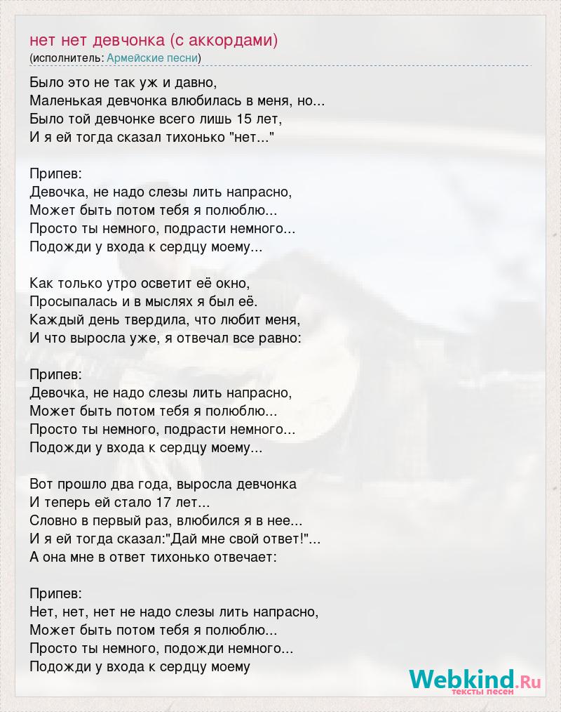 Было это не так уж и давно, Маленькая девчонка влюбилась в меня, но... Было той девчонке всего лишь 15 лет, И я ей тогда сказал тихонько "нет..." Припев: Девочка, не надо слезы лить напрасно, Может быть потом тебя я полюблю... Просто ты немного, подрасти немного... Подожди у входа к сердцу моему... Как только утро осветит её окно, Просыпалась и в мыслях я был её. Каждый день твердила, что любит меня, И что выросла уже, я отвечал все равно: Припев: Девочка, не надо слезы лить напрасно, Может быть потом тебя я полюблю... Просто ты немного, подрасти немного... Подожди у входа к сердцу моему... Вот прошло два года, выросла девчонка И теперь ей стало 17 лет... Словно в первый раз, влюбился я в нее... И я ей тогда сказал:"Дай мне свой ответ!"... А она мне в ответ тихонько отвечает: Припев: Нет, нет, нет не надо слезы лить напрасно, Может быть потом тебя я полюблю... Просто ты немного, подожди немного... Подожди у входа к сердцу моему