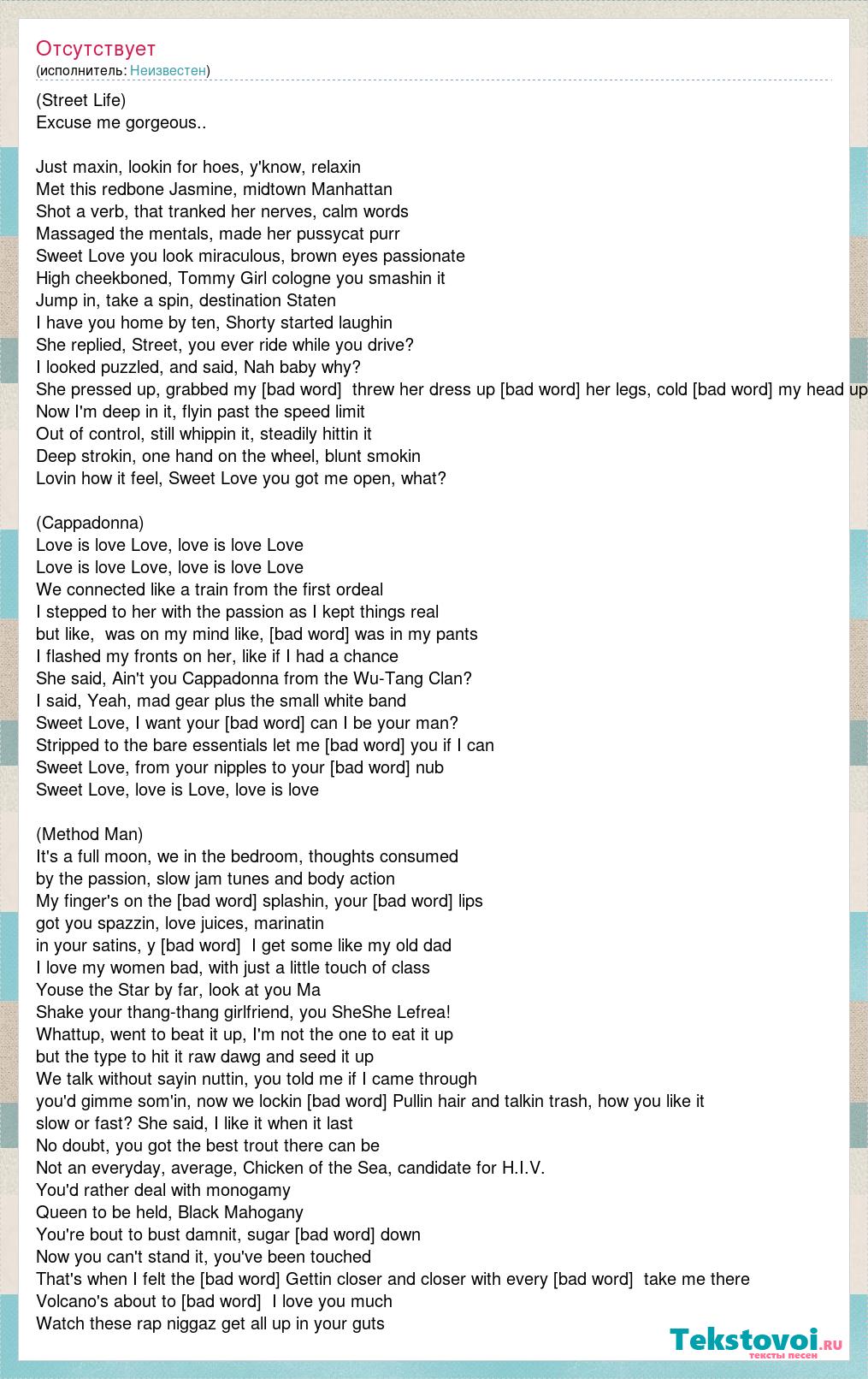 (Street Life) Excuse me gorgeous.. Just maxin, lookin for hoes, y'know, relaxin Met this redbone Jasmine, midtown Manhattan Shot a verb, that tranked her nerves, calm words Massaged the mentals, made her pussycat purr Sweet Love you look miraculous, brown eyes passionate High cheekboned, Tommy Girl cologne you smashin it Jump in, take a spin, destination Staten I have you home by ten, Shorty started laughin She replied, Street, you ever ride while you drive? I looked puzzled, and said, Nah baby why? She pressed up, grabbed my [bad word] threw her dress up [bad word] her legs, cold [bad word] my head up Now I'm deep in it, flyin past the speed limit Out of control, still whippin it, steadily hittin it Deep strokin, one hand on the wheel, blunt smokin Lovin how it feel, Sweet Love you got me open, what? (Cappadonna) Love is love Love, love is love Love Love is love Love, love is love Love We connected like a train from the first ordeal I stepped to her with the passion as I kept things real but like, was on my mind like, [bad word] was in my pants I flashed my fronts on her, like if I had a chance She said, Ain't you Cappadonna from the Wu-Tang Clan? I said, Yeah, mad gear plus the small white band Sweet Love, I want your [bad word] can I be your man? Stripped to the bare essentials let me [bad word] you if I can Sweet Love, from your nipples to your [bad word] nub Sweet Love, love is Love, love is love (Method Man) It's a full moon, we in the bedroom, thoughts consumed by the passion, slow jam tunes and body action My finger's on the [bad word] splashin, your [bad word] lips got you spazzin, love juices, marinatin in your satins, y [bad word] I get some like my old dad I love my women bad, with just a little touch of class Youse the Star by far, look at you Ma Shake your thang-thang girlfriend, you SheShe Lefrea! Whattup, went to beat it up, I'm not the one to eat it up but the type to hit it raw dawg and seed it up We talk without sayin nuttin, you told me if I came through you'd gimme som'in, now we lockin [bad word] Pullin hair and talkin trash, how you like it slow or fast? She said, I like it when it last No doubt, you got the best trout there can be Not an everyday, average, Chicken of the Sea, candidate for H.I.V. You'd rather deal with monogamy Queen to be held, Black Mahogany You're bout to bust damnit, sugar walls comin down Now you can't stand it, you've been touched That's when I felt the blood rush Gettin closer and closer with every thrust, take me there Volcano's about to erupt, I love you much Watch these rap niggaz get all up in your guts