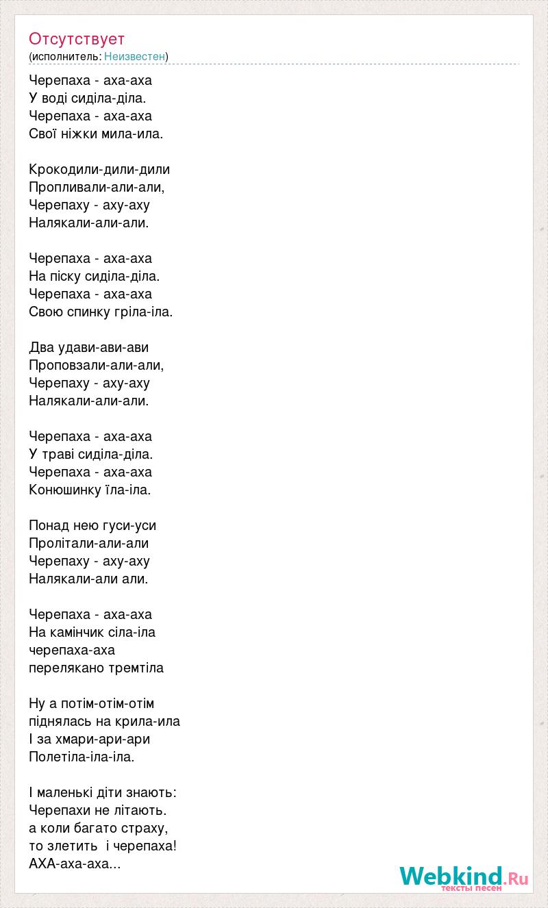Черепаха - аха-аха У воді сиділа-діла. Черепаха - аха-аха Свої ніжки мила-ила. Крокодили-дили-дили Пропливали-али-али, Черепаху - аху-аху Налякали-али-али. Черепаха - аха-аха На піску сиділа-діла. Черепаха - аха-аха Свою спинку гріла-іла. Два удави-ави-ави Проповзали-али-али, Черепаху - аху-аху Налякали-али-али. Черепаха - аха-аха У траві сиділа-діла. Черепаха - аха-аха Конюшинку їла-іла. Понад нею гуси-уси Пролітали-али-али Черепаху - аху-аху Налякали-али али. Черепаха - аха-аха На камінчик сіла-іла черепаха-аха перелякано тремтіла Ну а потім-отім-отім піднялась на крила-ила І за хмари-ари-ари Полетіла-іла-іла. І маленькі діти знають: Черепахи не літають. а коли багато страху, то злетить і черепаха! АХА-аха-аха...