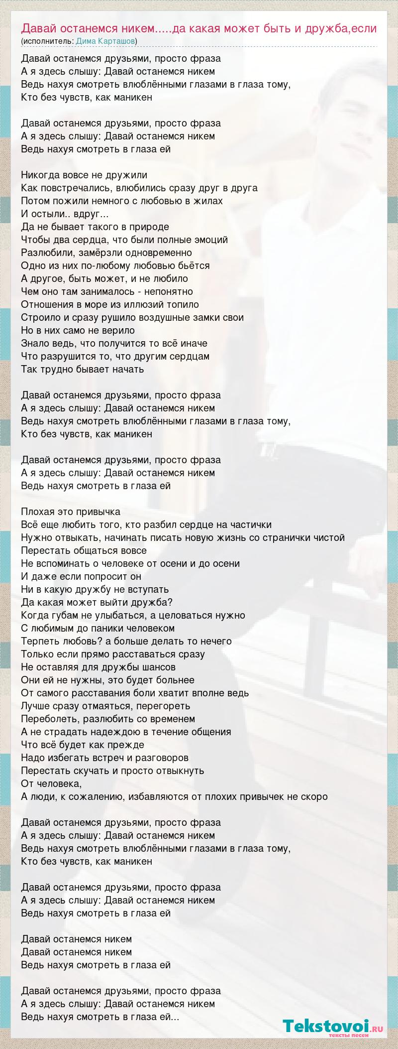 Давай останемся друзьями, просто фраза А я здесь слышу: Давай останемся никем Ведь нахуя смотреть влюблёнными глазами в глаза тому, Кто без чувств, как маникен Давай останемся друзьями, просто фраза А я здесь слышу: Давай останемся никем Ведь нахуя смотреть в глаза ей Никогда вовсе не дружили Как повстречались, влюбились сразу друг в друга Потом пожили немного с любовью в жилах И остыли.. вдруг... Да не бывает такого в природе Чтобы два сердца, что были полные эмоций Разлюбили, замёрзли одновременно Одно из них по-любому любовью бьётся А другое, быть может, и не любило Чем оно там занималось - непонятно Отношения в море из иллюзий топило Строило и сразу рушило воздушные замки свои Но в них само не верило Знало ведь, что получится то всё иначе Что разрушится то, что другим сердцам Так трудно бывает начать Давай останемся друзьями, просто фраза А я здесь слышу: Давай останемся никем Ведь нахуя смотреть влюблёнными глазами в глаза тому, Кто без чувств, как маникен Давай останемся друзьями, просто фраза А я здесь слышу: Давай останемся никем Ведь нахуя смотреть в глаза ей Плохая это привычка Всё еще любить того, кто разбил сердце на частички Нужно отвыкать, начинать писать новую жизнь со странички чистой Перестать общаться вовсе Не вспоминать о человеке от осени и до осени И даже если попросит он Ни в какую дружбу не вступать Да какая может выйти дружба? Когда губам не улыбаться, а целоваться нужно С любимым до паники человеком Терпеть любовь? а больше делать то нечего Только если прямо расставаться сразу Не оставляя для дружбы шансов Они ей не нужны, это будет больнее От самого расставания боли хватит вполне ведь Лучше сразу отмаяться, перегореть Переболеть, разлюбить со временем А не страдать надеждою в течение общения Что всё будет как прежде Надо избегать встреч и разговоров Перестать скучать и просто отвыкнуть От человека, А люди, к сожалению, избавляются от плохих привычек не скоро Давай останемся друзьями, просто фраза А я здесь слышу: Давай останемся никем Ведь нахуя смотреть влюблёнными глазами в глаза тому, Кто без чувств, как маникен Давай останемся друзьями, просто фраза А я здесь слышу: Давай останемся никем Ведь нахуя смотреть в глаза ей Давай останемся никем Давай останемся никем Ведь нахуя смотреть в глаза ей Давай останемся друзьями, просто фраза А я здесь слышу: Давай останемся никем Ведь нахуя смотреть в глаза ей...