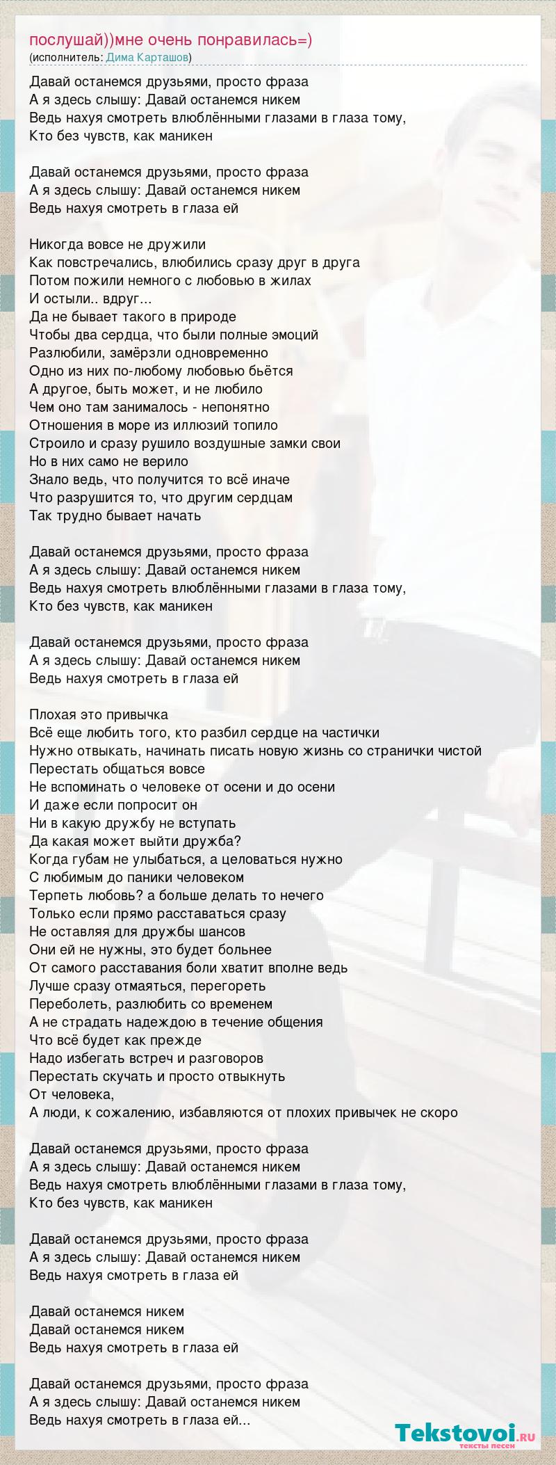 Давай останемся друзьями, просто фраза А я здесь слышу: Давай останемся никем Ведь нахуя смотреть влюблёнными глазами в глаза тому, Кто без чувств, как маникен Давай останемся друзьями, просто фраза А я здесь слышу: Давай останемся никем Ведь нахуя смотреть в глаза ей Никогда вовсе не дружили Как повстречались, влюбились сразу друг в друга Потом пожили немного с любовью в жилах И остыли.. вдруг... Да не бывает такого в природе Чтобы два сердца, что были полные эмоций Разлюбили, замёрзли одновременно Одно из них по-любому любовью бьётся А другое, быть может, и не любило Чем оно там занималось - непонятно Отношения в море из иллюзий топило Строило и сразу рушило воздушные замки свои Но в них само не верило Знало ведь, что получится то всё иначе Что разрушится то, что другим сердцам Так трудно бывает начать Давай останемся друзьями, просто фраза А я здесь слышу: Давай останемся никем Ведь нахуя смотреть влюблёнными глазами в глаза тому, Кто без чувств, как маникен Давай останемся друзьями, просто фраза А я здесь слышу: Давай останемся никем Ведь нахуя смотреть в глаза ей Плохая это привычка Всё еще любить того, кто разбил сердце на частички Нужно отвыкать, начинать писать новую жизнь со странички чистой Перестать общаться вовсе Не вспоминать о человеке от осени и до осени И даже если попросит он Ни в какую дружбу не вступать Да какая может выйти дружба? Когда губам не улыбаться, а целоваться нужно С любимым до паники человеком Терпеть любовь? а больше делать то нечего Только если прямо расставаться сразу Не оставляя для дружбы шансов Они ей не нужны, это будет больнее От самого расставания боли хватит вполне ведь Лучше сразу отмаяться, перегореть Переболеть, разлюбить со временем А не страдать надеждою в течение общения Что всё будет как прежде Надо избегать встреч и разговоров Перестать скучать и просто отвыкнуть От человека, А люди, к сожалению, избавляются от плохих привычек не скоро Давай останемся друзьями, просто фраза А я здесь слышу: Давай останемся никем Ведь нахуя смотреть влюблёнными глазами в глаза тому, Кто без чувств, как маникен Давай останемся друзьями, просто фраза А я здесь слышу: Давай останемся никем Ведь нахуя смотреть в глаза ей Давай останемся никем Давай останемся никем Ведь нахуя смотреть в глаза ей Давай останемся друзьями, просто фраза А я здесь слышу: Давай останемся никем Ведь нахуя смотреть в глаза ей...