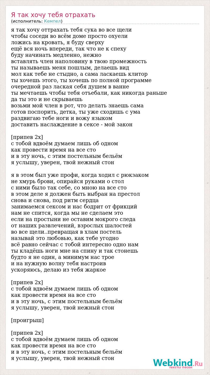 я так хочу оттрахать тебя сука во все щели чтобы соседи во всём доме просто охуели ложись на кровать, я буду сверху ещё вся ночь впереди, так что не к спеху буду начинать медленно, нежно вставлять член наполовину в твою промежность ты называешь меня пошлым, делаешь вид мол как тебе не стыдно, а сама ласкаешь клитор ты хочешь этого, ты хочешь по полной программе очередной раз лаская себя душем в ванне ты мечтаешь чтобы тебя отъебали, как никогда раньше да ты это и не скрываешь возьми мой член в рот, что делать знаешь сама готов поспорить, детка, ты уже сходишь с ума раздвигаю тебе ноги и вожу языком доставить наслаждение в сексе - мой закон [припев 2х] с тобой вдвоём думаем лишь об одном как провести время на все сто и в эту ночь, с этим постельным бельём я услышу, уверен, твой нежный стон я в этом был уже профи, когда ходил с рюкзаком не хмурь брови, опирайся руками о стол с ними было так себе, со мною на все сто в этом деле я должен быть выбран на престол снова и снова, под ритм сердца занимаемся сексом и нас бодрит от фрикций нам не спится, когда мы не сделаем это если на простыни не оставим мокрого следа от наших развлечений, взрослых шалостей во все щели..превращая в хлам постель называй это любовью, как тебе угодно всё равно сейчас с тобой интересно одно нам ты кладёшь ноги мне на спину и так стонешь будто я не один, а минимум нас трое и на нужную волну тебя настроив ускоряюсь, делаю из тебя жаркое [припев 2х] с тобой вдвоём думаем лишь об одном как провести время на все сто и в эту ночь, с этим постельным бельём я услышу, уверен, твой нежный стон [проигрыш] [припев 2х] с тобой вдвоём думаем лишь об одном как провести время на все сто и в эту ночь, с этим постельным бельём я услышу, уверен, твой нежный стон