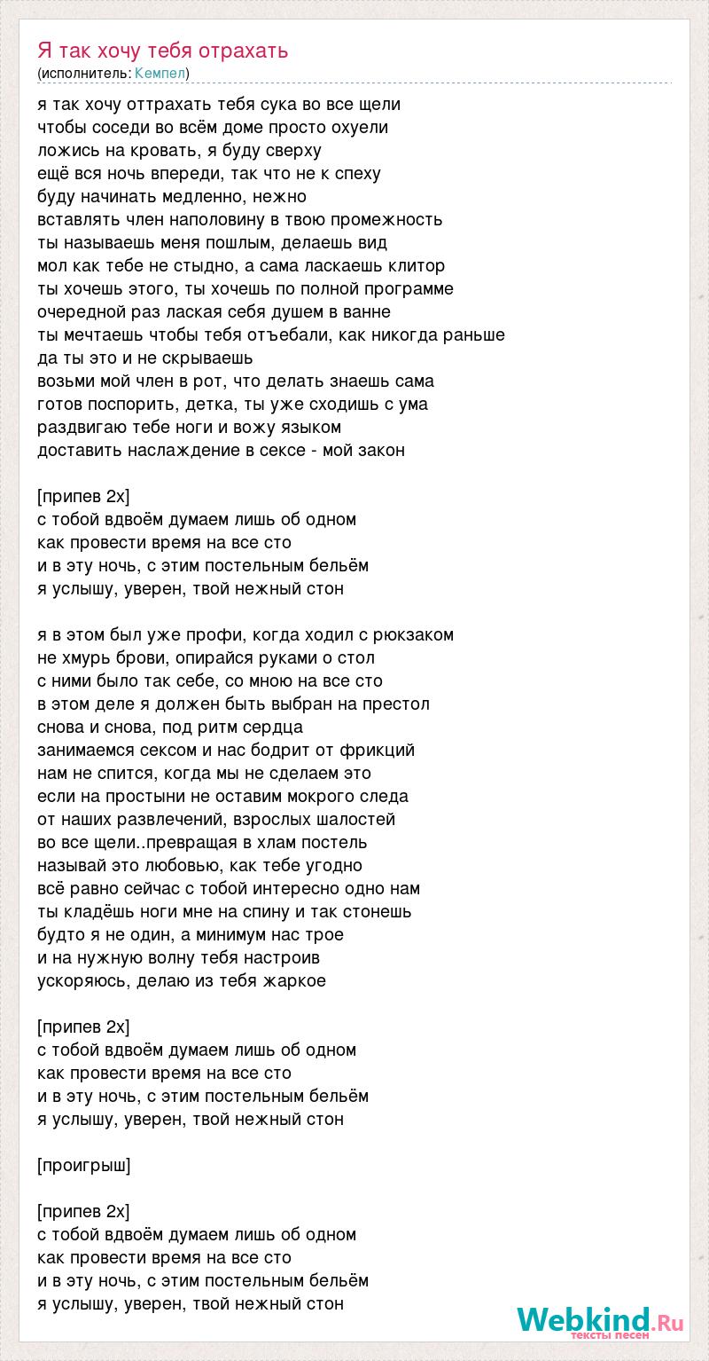 я так хочу оттрахать тебя сука во все щели чтобы соседи во всём доме просто охуели ложись на кровать, я буду сверху ещё вся ночь впереди, так что не к спеху буду начинать медленно, нежно вставлять член наполовину в твою промежность ты называешь меня пошлым, делаешь вид мол как тебе не стыдно, а сама ласкаешь клитор ты хочешь этого, ты хочешь по полной программе очередной раз лаская себя душем в ванне ты мечтаешь чтобы тебя отъебали, как никогда раньше да ты это и не скрываешь возьми мой член в рот, что делать знаешь сама готов поспорить, детка, ты уже сходишь с ума раздвигаю тебе ноги и вожу языком доставить наслаждение в сексе - мой закон [припев 2х] с тобой вдвоём думаем лишь об одном как провести время на все сто и в эту ночь, с этим постельным бельём я услышу, уверен, твой нежный стон я в этом был уже профи, когда ходил с рюкзаком не хмурь брови, опирайся руками о стол с ними было так себе, со мною на все сто в этом деле я должен быть выбран на престол снова и снова, под ритм сердца занимаемся сексом и нас бодрит от фрикций нам не спится, когда мы не сделаем это если на простыни не оставим мокрого следа от наших развлечений, взрослых шалостей во все щели..превращая в хлам постель называй это любовью, как тебе угодно всё равно сейчас с тобой интересно одно нам ты кладёшь ноги мне на спину и так стонешь будто я не один, а минимум нас трое и на нужную волну тебя настроив ускоряюсь, делаю из тебя жаркое [припев 2х] с тобой вдвоём думаем лишь об одном как провести время на все сто и в эту ночь, с этим постельным бельём я услышу, уверен, твой нежный стон [проигрыш] [припев 2х] с тобой вдвоём думаем лишь об одном как провести время на все сто и в эту ночь, с этим постельным бельём я услышу, уверен, твой нежный стон