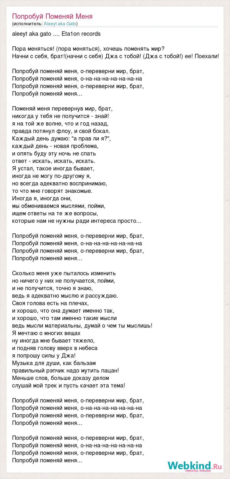 aleeyt aka gato .... Eta1on records Пора меняться! (пора меняться), хочешь поменять мир? Начни с себя, брат!(начни с себя) Джа с тобой! (Джа с тобой!) ее! Поехали! Попробуй поменяй меня, о-переверни мир, брат, Попробуй поменяй меня, о-на-на-на-на-на-на-на Попробуй поменяй меня, о-переверни мир, брат, Попробуй поменяй меня... Поменяй меня перевернув мир, брат, никогда у тебя не получится - знай! я на той же волне, что и год назад, правда потянул флоу, и свой бокал. Каждый день думаю: "а прав ли я?", каждый день - новая проблема, и опять буду эту ночь не спать ответ - искать, искать, искать. Я устал, такое иногда бывает, иногда не могу по-другому я, но всегда адекватно воспринимаю, то что мне говорят знакомые. Иногда я, иногда они, мы обмениваемся мыслями, пойми, ищем ответы на те же вопросы, которые нам не нужны ради интереса просто... Попробуй поменяй меня, о-переверни мир, брат, Попробуй поменяй меня, о-на-на-на-на-на-на-на Попробуй поменяй меня, о-переверни мир, брат, Попробуй поменяй меня... Сколько меня уже пыталось изменить но ничего у них не получается, пойми, и не получится, точно я знаю, ведь я адекватно мыслю и рассуждаю. Своя голова есть на плечах, и хорошо, что она думает именно так, и хорошо, что там именно такие мысли ведь мысли материальны, думай о чем ты мыслишь! Я мечтаю о многих вещах ну иногда мне бывает тяжело, и подняв голову вверх в небеса я попрошу силы у Джа! Музыка для души, как бальзам правильный рэпчик надо мутить пацан! Меньше слов, больше доказу делом слушай мой трек и пусть качает эта тема! Попробуй поменяй меня, о-переверни мир, брат, Попробуй поменяй меня, о-на-на-на-на-на-на-на Попробуй поменяй меня, о-переверни мир, брат, Попробуй поменяй меня... Попробуй поменяй меня, о-переверни мир, брат, Попробуй поменяй меня, о-на-на-на-на-на-на-на Попробуй поменяй меня, о-переверни мир, брат, Попробуй поменяй меня...