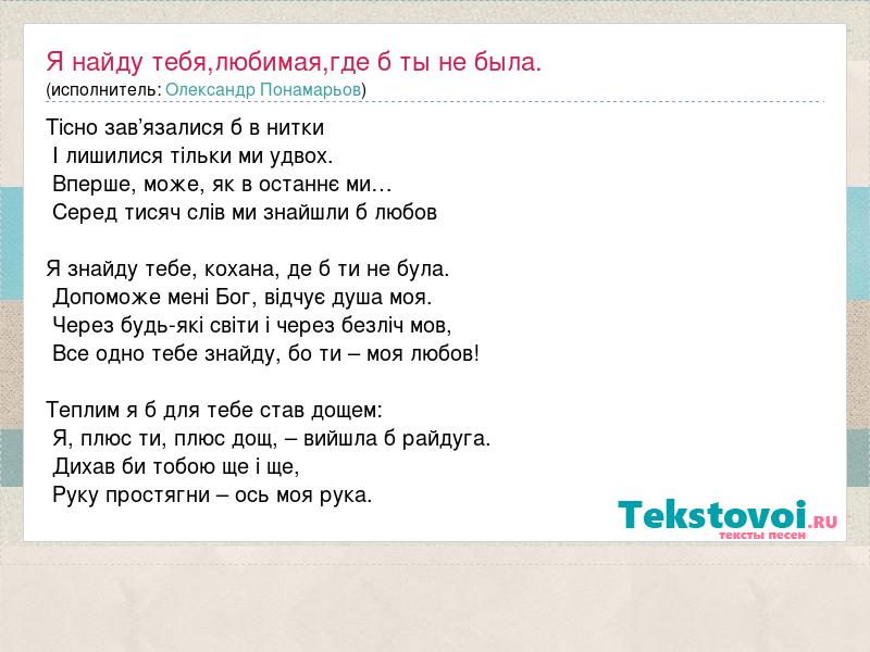 Тісно зав’язалися б в нитки І лишилися тільки ми удвох. Вперше, може, як в останнє ми… Серед тисяч слів ми знайшли б любов Я знайду тебе, кохана, де б ти не була. Допоможе мені Бог, відчує душа моя. Через будь-які світи і через безліч мов, Все одно тебе знайду, бо ти – моя любов! Теплим я б для тебе став дощем: Я, плюс ти, плюс дощ, – вийшла б райдуга. Дихав би тобою ще і ще, Руку простягни – ось моя рука.