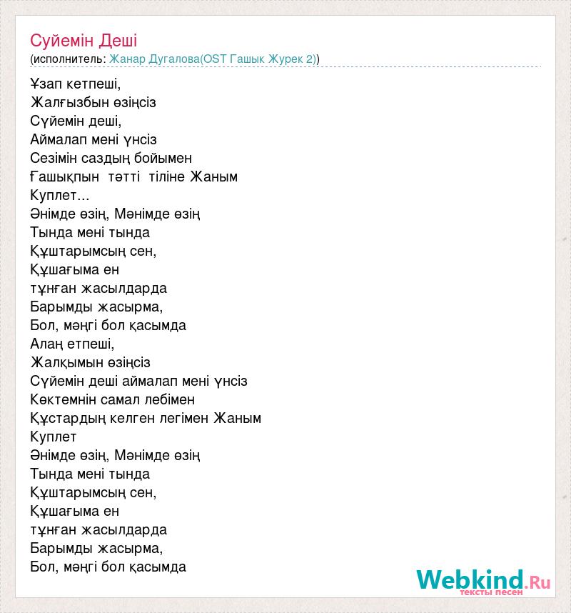 Ұзап кетпеші, Жалғызбын өзіңсіз Сүйемін деші, Аймалап мені үнсіз Сезімін саздың бойымен Ғашықпын тәтті тіліне Жаным Куплет... Әнімде өзің, Мәнімде өзің Тында мені тында Құштарымсың сен, Құшағыма ен тұнған жасылдарда Барымды жасырма, Бол, мәңгі бол қасымда Алаң етпеші, Жалқымын өзіңсіз Сүйемін деші аймалап мені үнсіз Көктемнін самал лебімен Құстардың келген легімен Жаным Куплет Әнімде өзің, Мәнімде өзің Тында мені тында Құштарымсың сен, Құшағыма ен тұнған жасылдарда Барымды жасырма, Бол, мәңгі бол қасымда