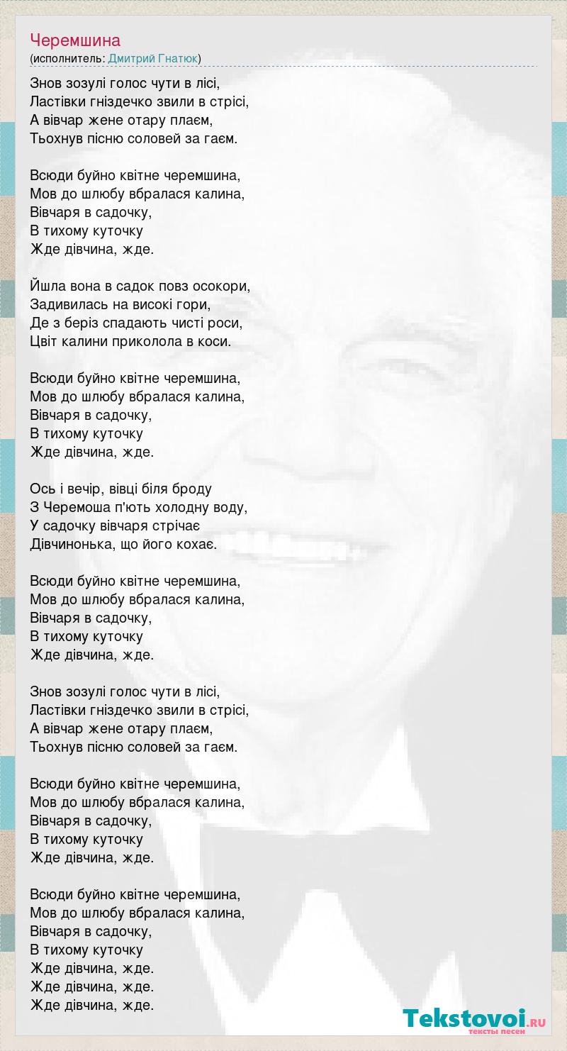 Знов зозулі голос чути в лісі, Ластівки гніздечко звили в стрісі, А вівчар жене отару плаєм, Тьохнув пісню соловей за гаєм. Всюди буйно квітне черемшина, Мов до шлюбу вбралася калина, Вівчаря в садочку, В тихому куточку Жде дівчина, жде. Йшла вона в садок повз осокори, Задивилась на високі гори, Де з беріз спадають чисті роси, Цвіт калини приколола в коси. Всюди буйно квітне черемшина, Мов до шлюбу вбралася калина, Вівчаря в садочку, В тихому куточку Жде дівчина, жде. Ось і вечір, вівці біля броду З Черемоша п'ють холодну воду, У садочку вівчаря стрічає Дівчинонька, що його кохає. Всюди буйно квітне черемшина, Мов до шлюбу вбралася калина, Вівчаря в садочку, В тихому куточку Жде дівчина, жде. Знов зозулі голос чути в лісі, Ластівки гніздечко звили в стрісі, А вівчар жене отару плаєм, Тьохнув пісню соловей за гаєм. Всюди буйно квітне черемшина, Мов до шлюбу вбралася калина, Вівчаря в садочку, В тихому куточку Жде дівчина, жде. Всюди буйно квітне черемшина, Мов до шлюбу вбралася калина, Вівчаря в садочку, В тихому куточку Жде дівчина, жде. Жде дівчина, жде. Жде дівчина, жде.