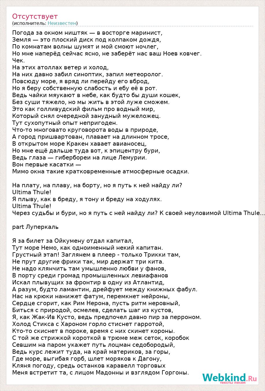 Погода за окном ништяк — в восторге маринист, Земля — это плоский диск под колпаком дождя, По комнатам волны шумят и мой смоют ночлег, Но мне наперёд сейчас ясно, не заберёт нас ваш Ноев ковчег. Чек. На этих атоллах ветер и холод, На них давно забил синоптик, запил метеоролог. Повсюду море, я вряд ли перейду его вброд, Но я беру собственную слабость и ебу её в рот. Ведь чайки мяукают в небе, как будто бы души кошек, Без суши тяжело, но мы жить в этой луже сможем. Это как голливудский фильм про водный мир, Который снял очередной занудный мужеложец. Тут сухопутный опыт непригоден. Что-то многовато круговорота воды в природе, А город пришвартован, плавает на длинном тросе, В открытом море Кракен хавает авианосец, Но мне ещё дальше туда вот, к эпицентру бури, Ведь глаза — гибербореи на лице Лемурии. Вон первые касатки — Мимо окна такие кратковременные атмосферные осадки. На плату, на плаву, на борту, но я путь к ней найду ли? Ultima Thule! Я плыву, как в бреду, я тону и бреду на ходулях. Ultima Thule! Через судьбы и бури, но я путь с ней найду ли? К своей неуловимой Ultima Thule... part Луперкаль Я за билет за Ойкумену отдал капитал, Тут море Немо, как одноименный некий капитан. Грустный этап! Заглянем в плеер - только Трикки там, Не прут другие фрики так, мир держат три кита. Не надо клянчить там умышленно любви у фанов, В порту среди громад промышленных левиафанов Искал плывущих за фронтир в одну из Атлантид, А разум, будто ламантин, дрейфует между книжных фабул. Нас на крюки нанижет фатум, перемкнет нейроны, Сердце сгорит, как Рим Нерона, пусть ритм неровный, Биться с природой, осмелев, сделать шаг из кустов, Я, как Жак-Ив Кусто, ведь предпочел давно пир за перроном. Холод Стикса с Хароном горло стиснет гарротой, Кто-то скиснет в пороке, время с них скинет короны. С той же стрижкой короткой в трюме меж сеток, коробок Севшим на паром укажет путь лоцман седобородый, Ведь курс лежит туда, на край материков, за горы, Где море, выгибая горб, шлет моряков к Дагону, Кляня погоду, средь останков каравелл торговых Меня встретит та, с лицом Мадонны и взглядом Горгоны.