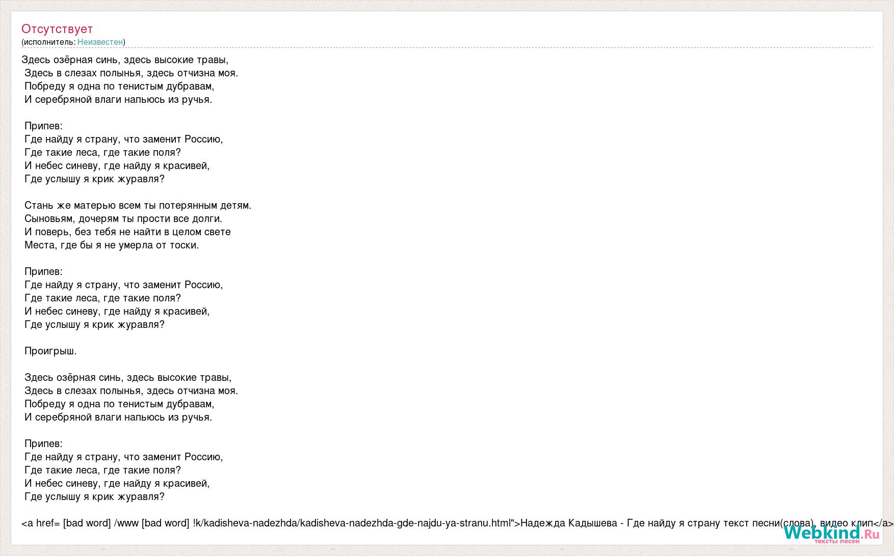 Здесь озёрная синь, здесь высокие травы, Здесь в слезах полынья, здесь отчизна моя. Побреду я одна по тенистым дубравам, И серебряной влаги напьюсь из ручья. Припев: Где найду я страну, что заменит Россию, Где такие леса, где такие поля? И небес синеву, где найду я красивей, Где услышу я крик журавля? Стань же матерью всем ты потерянным детям. Сыновьям, дочерям ты прости все долги. И поверь, без тебя не найти в целом свете Места, где бы я не умерла от тоски. Припев: Где найду я страну, что заменит Россию, Где такие леса, где такие поля? И небес синеву, где найду я красивей, Где услышу я крик журавля? Проигрыш. Здесь озёрная синь, здесь высокие травы, Здесь в слезах полынья, здесь отчизна моя. Побреду я одна по тенистым дубравам, И серебряной влаги напьюсь из ручья. Припев: Где найду я страну, что заменит Россию, Где такие леса, где такие поля? И небес синеву, где найду я красивей, Где услышу я крик журавля? <a href= [bad word] /www [bad word] !k/kadisheva-nadezhda/kadisheva-nadezhda-gde-najdu-ya-stranu.html">Надежда Кадышева - Где найду я страну текст песни(слова), видео клип</a>