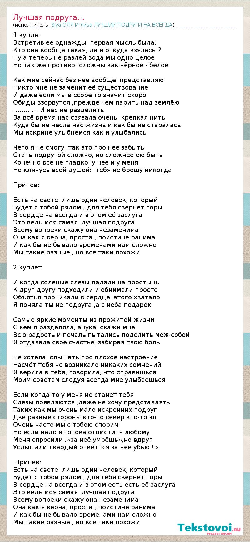 1 куплет Встретив её однажды, первая мысль была: Кто она вообще такая, да и откуда взялась!? Ну а теперь не разлей вода мы одно целое Но так же противоположны как чёрное - белое Как мне сейчас без неё вообще представляю Никто мне не заменит её существование И даже если мы в ссоре то значит скоро Обиды взорвутся ,прежде чем парить над землёю ………….И нас не разделить За всё время нас связала очень крепкая нить Куда бы не несла нас жизнь и как бы не старалась Мы искрине улыбнёмся как и улыбались Чего я не смогу ,так это про неё забыть Стать подругой сложно, но сложнее ею быть Конечно всё не гладко у неё и у меня Но клянусь всей душой: тебя не брошу никогда Припев: Есть на свете лишь один человек, который Будет с тобой рядом , для тебя свернёт горы В сердце на всегда и в этом её заслуга Это ведь моя самая лучшая подруга Всему вопреки скажу она незаменима Она как я верна, проста , поистине ранима И как бы не бывало временами нам сложно Мы такие разные , но всё таки похожи 2 куплет И когда солёные слёзы падали на простынь К друг другу подходили и обнимали просто Объятья проникали в сердце этого хватало Я поняла ты не подруга ,а с неба подарок Самые яркие моменты из прожитой жизни С кем я разделяла, анука скажи мне Всю радость и печаль пытались поделить меж собой Я отдавала своё счастье ,забирая твою боль Не хотела слышать про плохое настроение Насчёт тебя не возникало никаких сомнений Я верила в тебя, говорила, что справишься Моим советам следуя всегда мне улыбаешься Если когда-то у меня не станет тебя Слёзы появляются ,даже не хочу представлять Таких как мы очень мало искренних подруг Две разные стороны кто-то север кто-то юг. Очень часто мы с тобою спорим Но если надо я готова отомстить любому Меня спросили :«за неё умрёшь»,но вдруг Услышали твёрдый ответ « я за неё убью !» Припев: Есть на свете лишь один человек, который Будет с тобой рядом , для тебя свернёт горы В сердце на всегда и в этом есть есть её заслуга Это ведь моя самая лучшая подруга Всему вопреки скажу она незаменима Она как я верна, проста , поистине ранима И как бы не бывало временами нам сложно Мы такие разные , но всё таки похожи