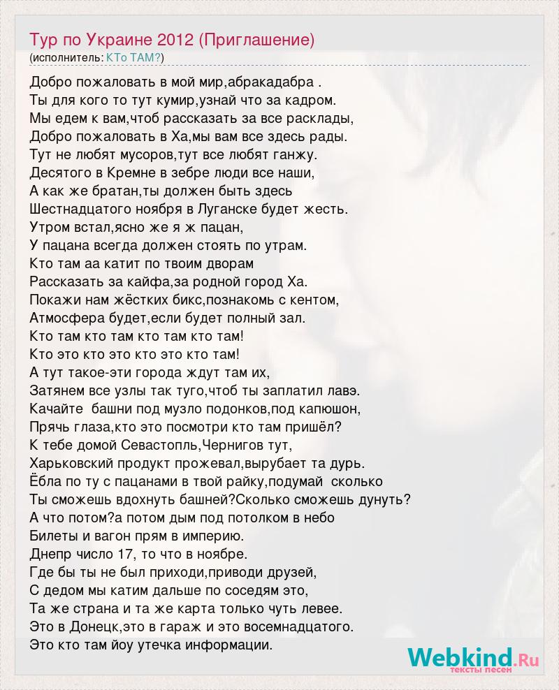 Добро пожаловать в мой мир,абракадабра . Ты для кого то тут кумир,узнай что за кадром. Мы едем к вам,чтоб рассказать за все расклады, Добро пожаловать в Ха,мы вам все здесь рады. Тут не любят мусоров,тут все любят ганжу. Десятого в Кремне в зебре люди все наши, А как же братан,ты должен быть здесь Шестнадцатого ноября в Луганске будет жесть. Утром встал,ясно же я ж пацан, У пацана всегда должен стоять по утрам. Кто там аа катит по твоим дворам Рассказать за кайфа,за родной город Ха. Покажи нам жёстких бикс,познакомь с кентом, Атмосфера будет,если будет полный зал. Кто там кто там кто там кто там! Кто это кто это кто это кто там! А тут такое-эти города ждут там их, Затянем все узлы так туго,чтоб ты заплатил лавэ. Качайте башни под музло подонков,под капюшон, Прячь глаза,кто это посмотри кто там пришёл? К тебе домой Севастопль,Чернигов тут, Харьковский продукт прожевал,вырубает та дурь. Ёбла по ту с пацанами в твой райку,подумай сколько Ты сможешь вдохнуть башней?Сколько сможешь дунуть? А что потом?а потом дым под потолком в небо Билеты и вагон прям в империю. Днепр число 17, то что в ноябре. Где бы ты не был приходи,приводи друзей, С дедом мы катим дальше по соседям это, Та же страна и та же карта только чуть левее. Это в Донецк,это в гараж и это восемнадцатого. Это кто там йоу утечка информации.