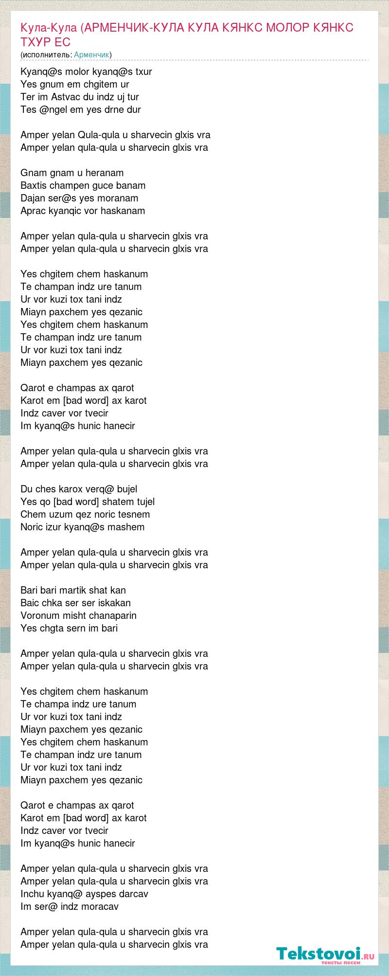 Главная→Исполнители→Арменчик→Кула-Кула (АРМЕНЧИК-КУЛА КУЛА КЯНКС МОЛОР КЯНКС ТХУР ЕС ГНУМЕМ ЧЕ ГИТЕМ УР