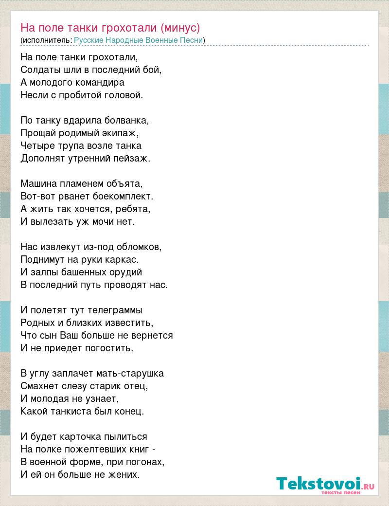 На поле танки грохотали, Солдаты шли в последний бой, А молодого командира Несли с пробитой головой. По танку вдарила болванка, Прощай родимый экипаж, Четыре трупа возле танка Дополнят утренний пейзаж. Машина пламенем объята, Вот-вот рванет боекомплект. А жить так хочется, ребята, И вылезать уж мочи нет. Нас извлекут из-под обломков, Поднимут на руки каркас. И залпы башенных орудий В последний путь проводят нас. И полетят тут телеграммы Родных и близких известить, Что сын Ваш больше не вернется И не приедет погостить. В углу заплачет мать-старушка Смахнет слезу старик отец, И молодая не узнает, Какой танкиста был конец. И будет карточка пылиться На полке пожелтевших книг - В военной форме, при погонах, И ей он больше не жених.